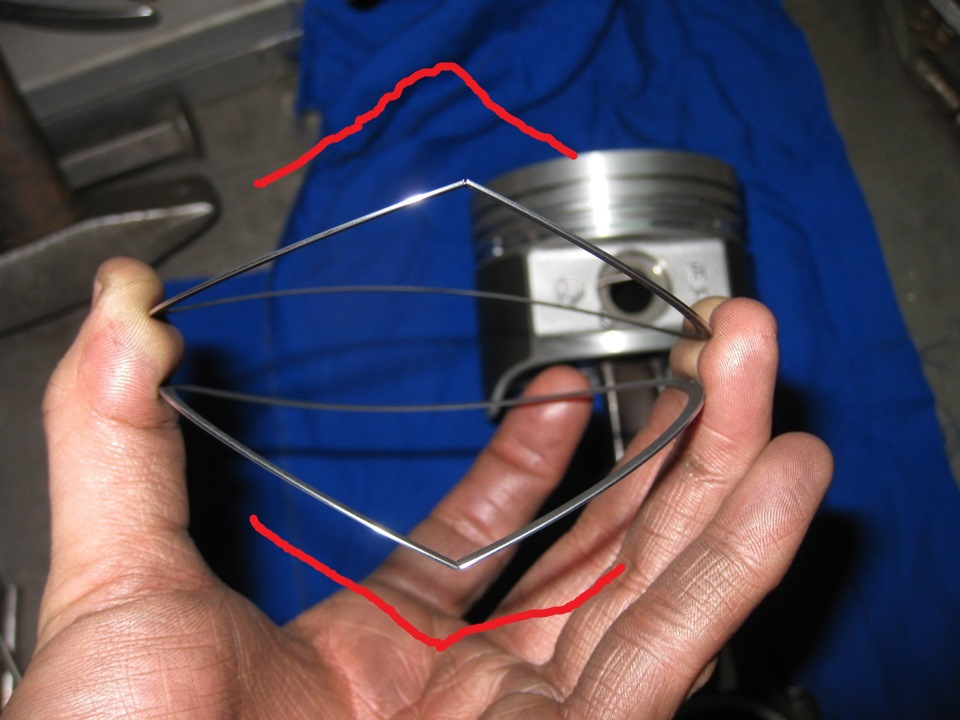 Если на наборных маслосъемных кольцах нет маркировки какой стороной вверх, то это все танцы с бубном про изгиб, нигде это не указано, даже в офиц видео кольбеншмидта по установке всех колец на поршень этого нет, профиль кольца симметричный, а в сборе в цилиндре не будут они так сильно гнуться, чтобы была разница, я сам брал поршни nural на которых уже были кольца и снимал их чтобы делать доп отверстия для отвода масла в канале (болячка фокуса 2 это с завода на 1.8 и 2л) так они были все поставлены "неправильно" с завода, компрессионные маркировками вверх, так что я думаю это все выдумки