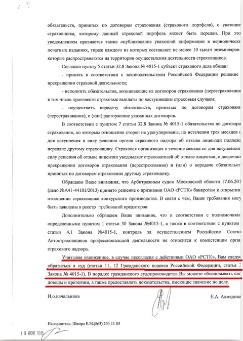 По теме "Заявление в ВСК о перерасчете", не вижу смысла, т.к. ответ ясен и толку не будет. ВСК мне не сделает выше КБМ, т.к. РСТК запорол мою скидку. Добиться что-либо самому (через суд) или с помощью РСА от РСТК, не вижу способным. Если дело в суде будет заведено на РСТК, то будут искать бывшего "владельца", если найдут, то дело будет рассматриваться прошлой датой, а то что полис у меня закончился по сроку уже позже отзыва лицензии у фирмы, то … вообщем, просто трата времени и сил. Кстати, как проконсультировал юрист, даже если РСТК через суд, подаст о тебе данные на тот момент, мне будет произведен перерасчет КБМ, судебные издержки не кто не выплатит.