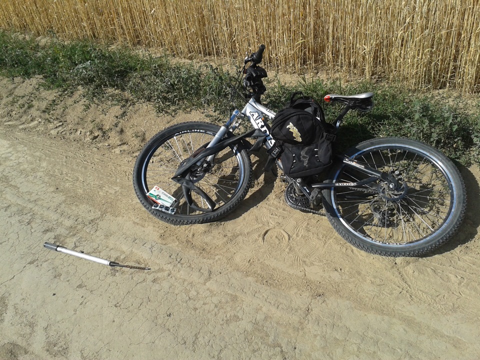 Начну с того что отъехав от дома 3 км, я пробиваю переднее колесо, латка наждачка, клей, насос и едем дальше.