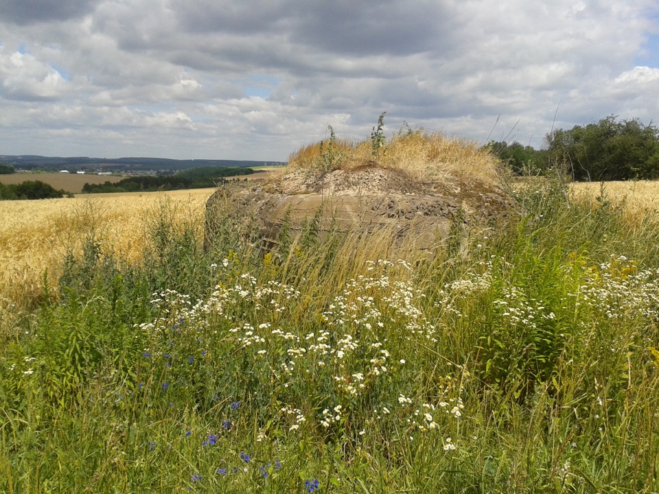 Дальше поехал в поля, к ДОТ-у № 307. Что бы добраться к нему пришлось ехать сквозь пшеницу. На ДОТ-е видны следы обстрела.