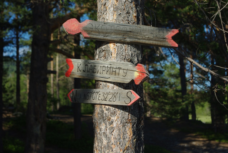 Покончив возиться с машиной, я вколотил в навигатор координаты кандалакшинского лабиринта. До него было реально рукой подать. Мы выехали за край города, а через четыре километра доехали до стоянки у какого-то горнолыжного объекта. Оттуда немного спустились по грунтовке с камнями вниз, но совсем чуть-чуть, так как Аня запротестовала, мол, мы не сможем выехать обратно – слишком крутой наклон дороги и слишком плохая дорога. Как я её не уговаривал, что машина сможет, что у нас не пузотёрка, а полноценный внедорожник, что там есть следы даже шоссейной резины, а у нас вообще резина злая и пройдёт гораздо лучше… Самое большее, что мне удалось – проехать метров триста. По ручью, образовавшему грязь, по куску наклонной дороги за два поворота и по крутому спуску. После этого пришлось уступить. Дорога и в самом деле даже на этом участке выглядела пугающе для жителя города на болоте. Тем более, Аня мне привела в довод мои же слова, перефразировав их под этот случай.