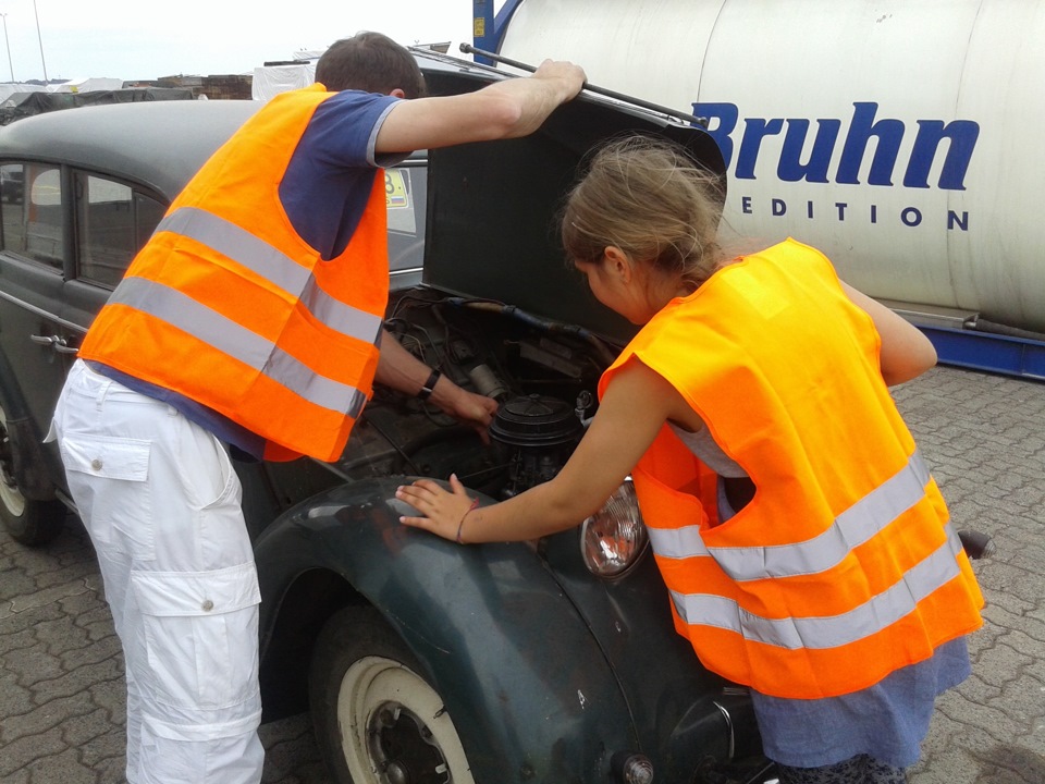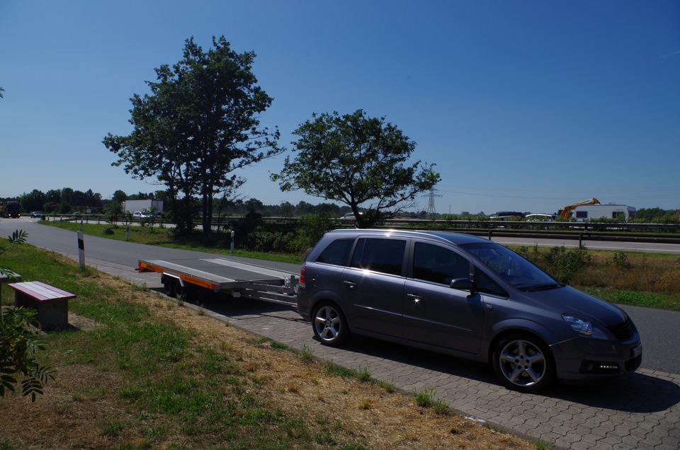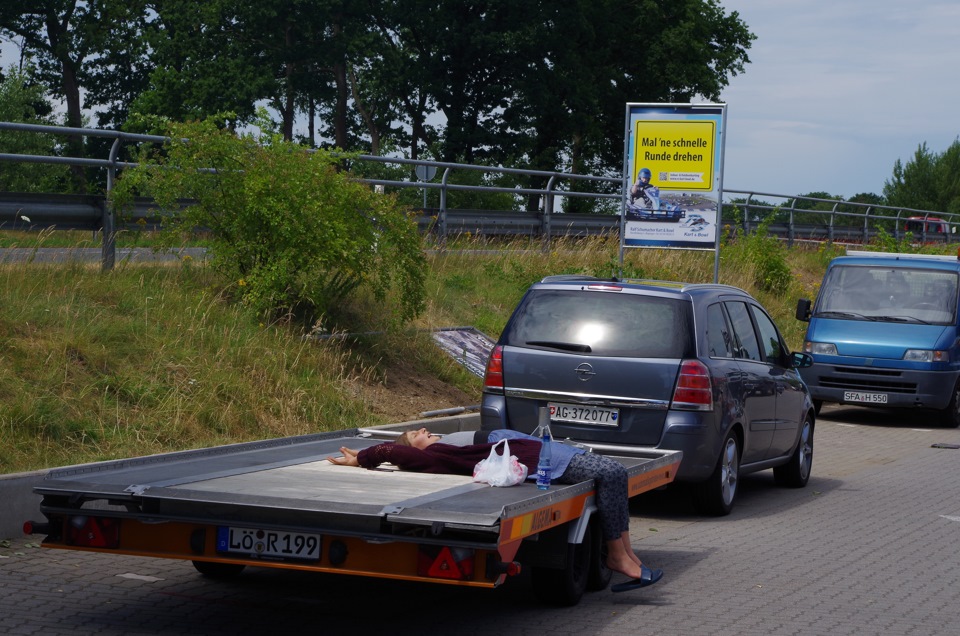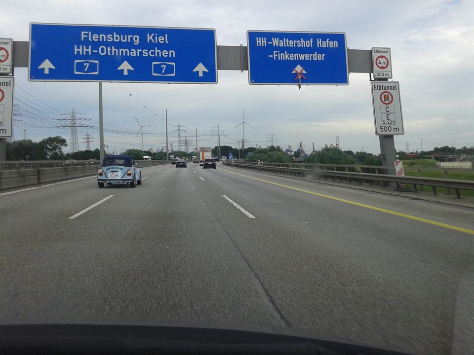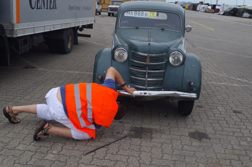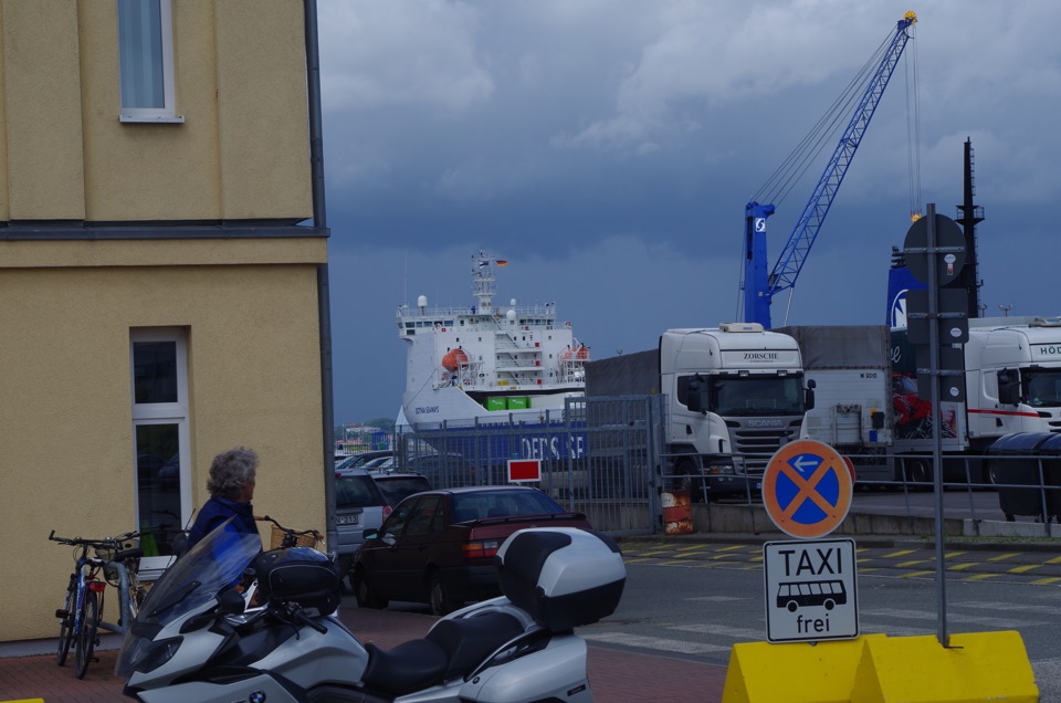 Ехали очень долго, в те дни в Германии жара стояла до 40°, на 7ом автобане поднялись местами плиты, задрав асфальт. Были закрыты полосы и велись дорожные работы — ограничение доходило до 40км/ч. Но всё таки к 16 часам доплелись до порта — а это, можно сказать, конец рабочего дня (нам даже 2 раза звонили, когда мы будем) .
