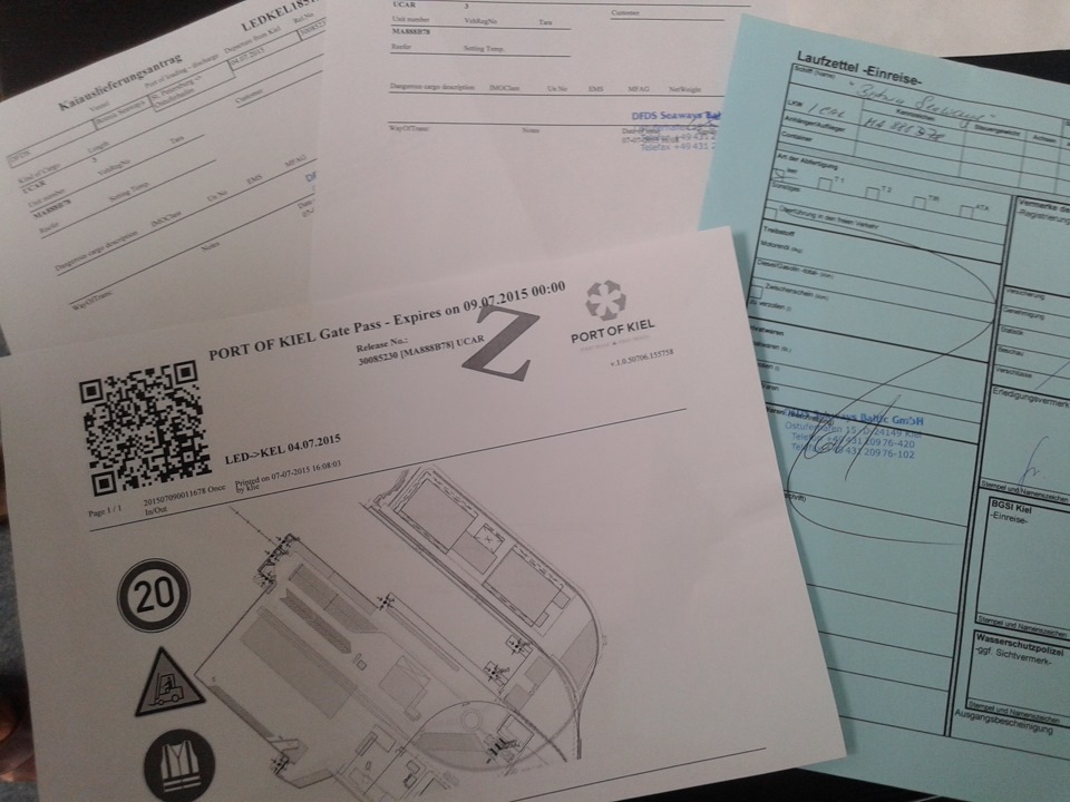 В справке спросили куда нам и что… Взяли номерок, ждём к какому окошку позовут, а время когда не надо так быстро идёт. Подходит молодой человек, представитель фирмы — "Вы за Москвичом ? — Пройдёмте." -А как же номерок? — "Да мы вас уже с утра ждём, тут уже половина работников порта около него перефоткалась"- (приятно). Проверил мои документы(я получатель) и подаёт бумаги: план порта, где получать капитанский конверт, место стоянки и пропуски на вход и на выезд(всё общение на немецком).