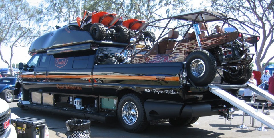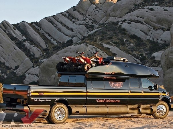 Помимо того, что этот дом на колесах оснащен массой удобств внутри, он еще может многое вместить и снаружи. На крышу с легкостью помещаются 2 квадроцикла, в кузов — небольшой внедорожник, а в прицеп спокойно войдет среднеразмерный автомобиль.