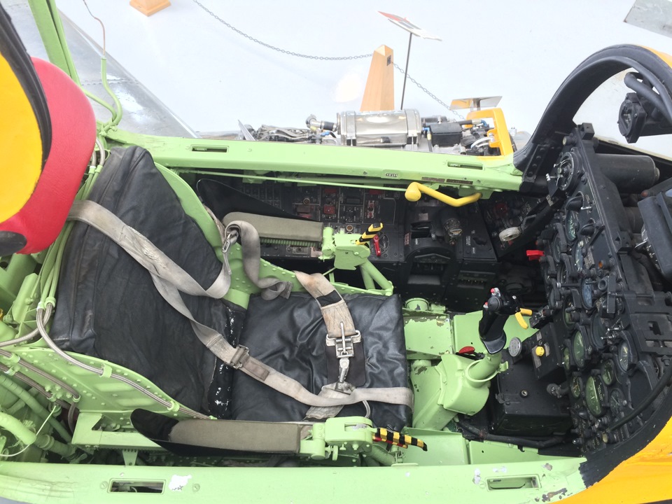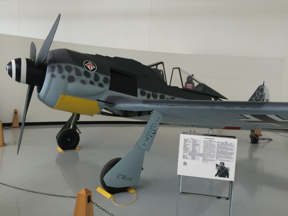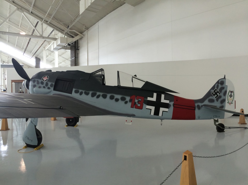 Тут же рядом стоит Focke-Wulf 190 A-7 с двигателем BMW начавший свою жизнь в далеком 1943 году. Этот самолет пилотировал командир эскадрона. Обычно таким машинам присваивали цифру 1, но Хаинц Прицль прикащал поменять число на свое любимое — 13. Желтая окраска части днища служила знаком для немецких пулеметчиков и зенитчиков. Некая допотопная система свой-чужой.