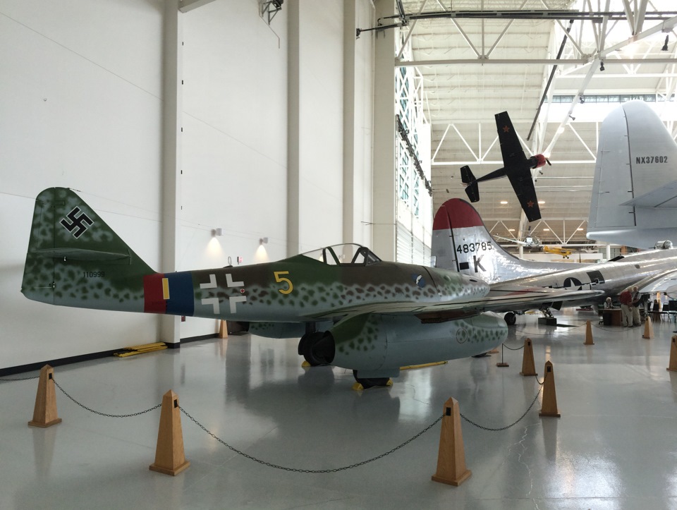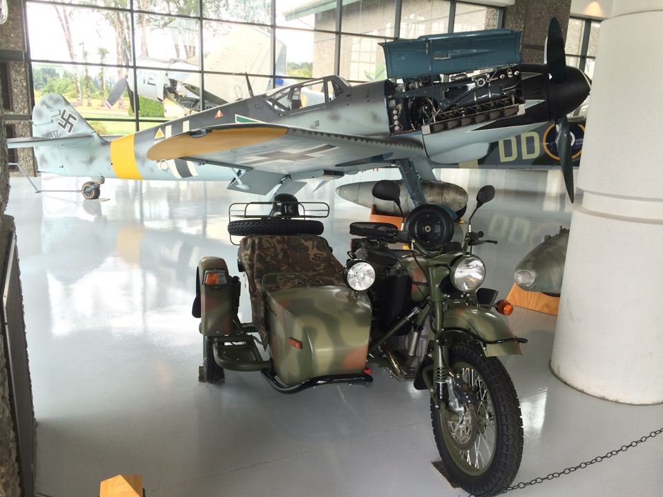 Но это еще не конец истории. Когда вы только подумали, что хуже быть не может, то перед вами встает общая картина сей экспозиции. Это не что иное, как российский мотоцикл Урал, с эСеСовской каской на багажнике, на фоне Мессершмита Bf 109! Только MG42 в коляске не хватает. Этот Мессер Bf 109 G-10 Gustav построен в конце 1944 и переправлен для выполнения боевых задач в Болгарию. После войны эту машину выкупила Югославия, потом в 1984 самолет выкупили британцы и уже только в 1991 он прибыл в США.