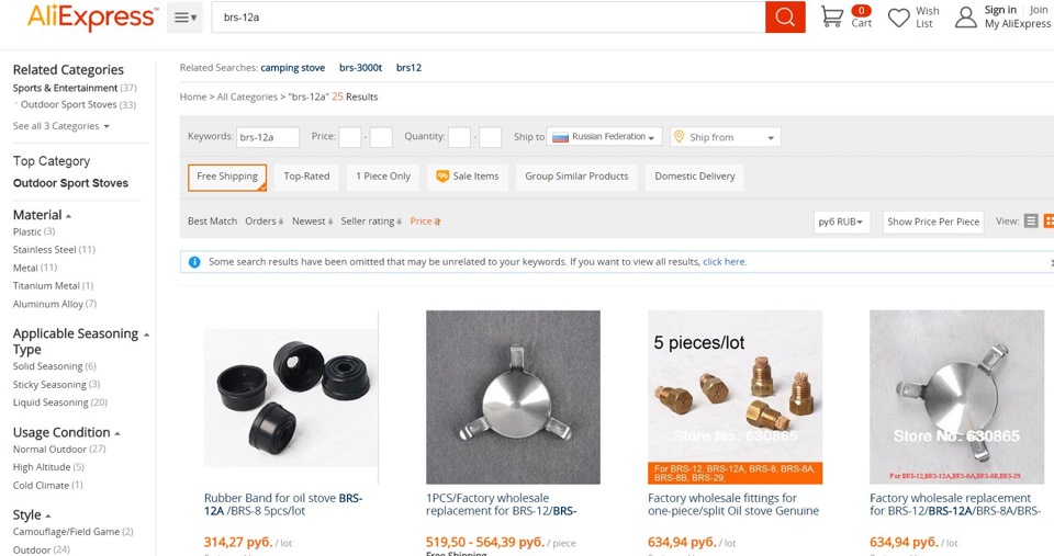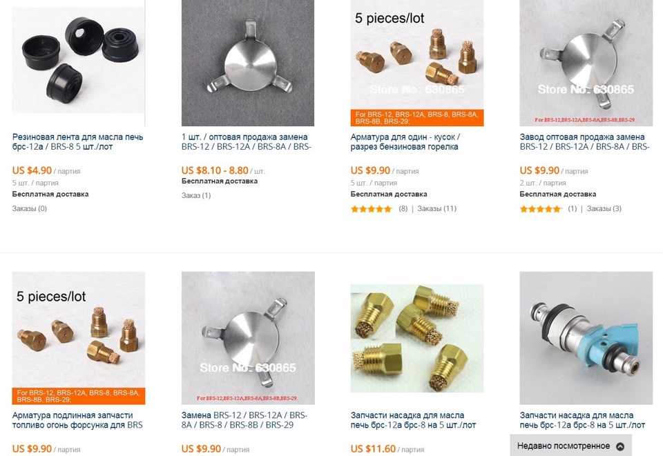 Итак, ищем что есть из китайских горелок на aliexpress. Видим, что часто попадаются горелки бренда BRS, и что особенно важно, к ним также продаются запчасти(!), и они недорогие. Итак останавливаемся на «фирменном» бренде).