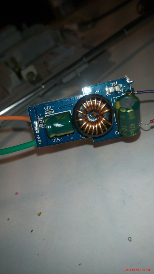 Ну вот почти и всё. Обматываем изолентой почти всё, чтобы не коротнуло об металлические детали, но не рекомендую обматывать место где сама микросхемка, т.к. она очень греется и может оплавить изоленту. В моём случае получилось как на фото. Контакты боковины я обернул, плюс часть платы с USB портом, а дальше оборачивать изолентой смысла нет, т.к. никаких острых металлических частей, которые могли бы закоротить в районе плафонов нет, а при таком полуоткрытом виде всегда будет хорошая вентиляция для преобразователя напряжения.