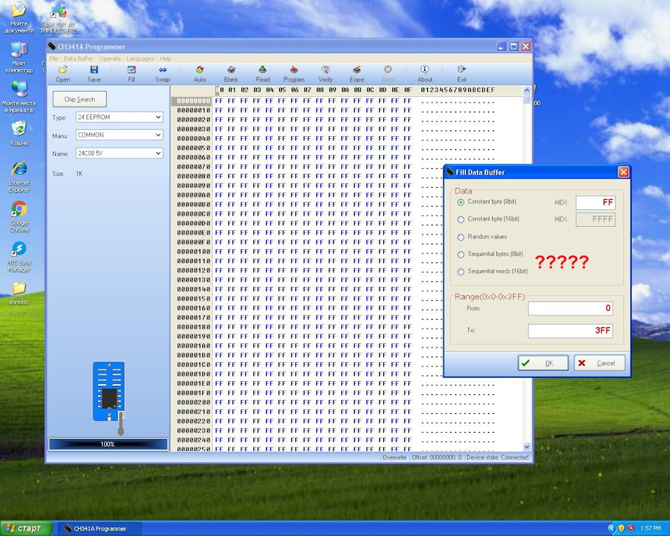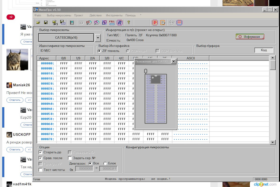 3. Подключаем программатор, клипсу на микросхему, выбираем тип микросхеме 93LC86 (8bit), жмем считать и, барабанная дробь, получаем сплошные FF FF FF FF FF… т.е. не читается. (((