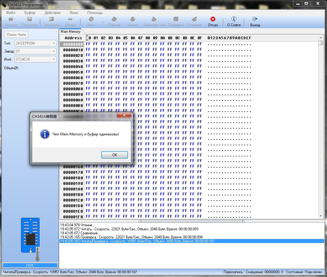 Подключал EZP2010 к той же микросхеме 24C02 и считывание происходит корректно и идентично CH341A, т.е. программатор EZP2010 работает.
