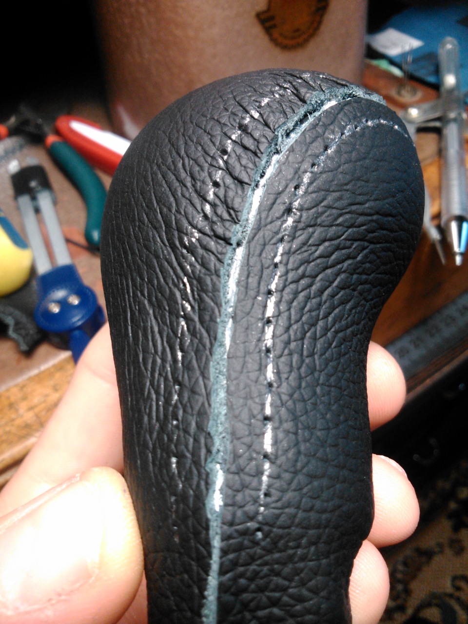 Сильней затягивать нужно просто было, кожа со светлой изнанкой, не учел этого. Сейчас кожа с черной замшей, этого не видно. На ручке на глаз отверстия пробивались с одной стороны, вот и кривенько маленько.