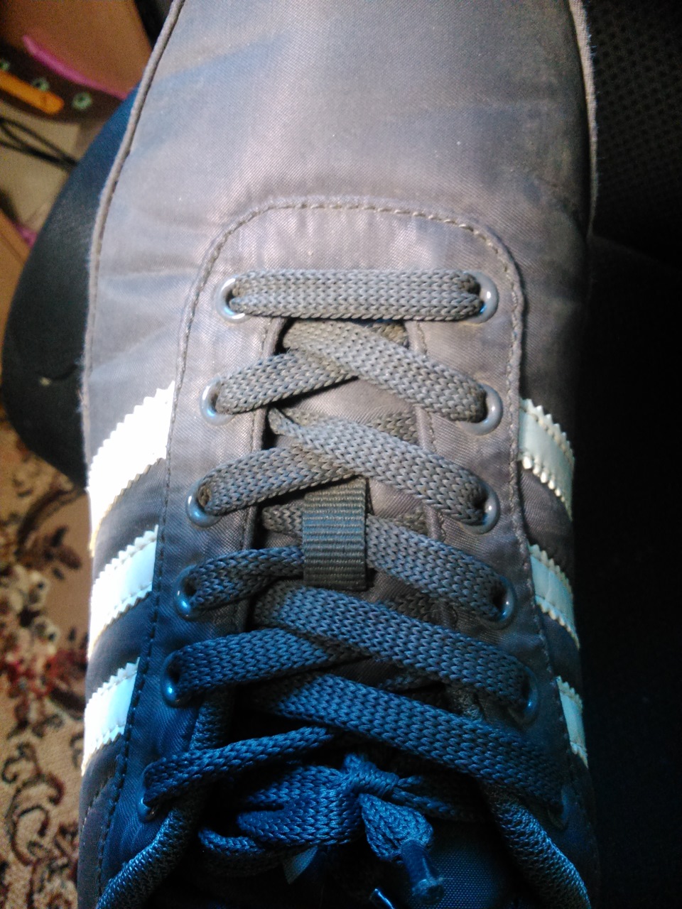 Все люди сами того не зная, еще с детского сада умеют заплетать елочку. Все элементарно как 2х2. Единственное, на фото моего кроссовка, шнуровка мужская, это когда шнурки продеваются сверху, а нашу ёлочку лучше заплетать женской шнуровкой (продевать иглы снизу), так шов будет более правильный и объемный после затяжки. Нужно лишь ровно пробить дырочки, а этому в первой части мы с Вами уже научились.
