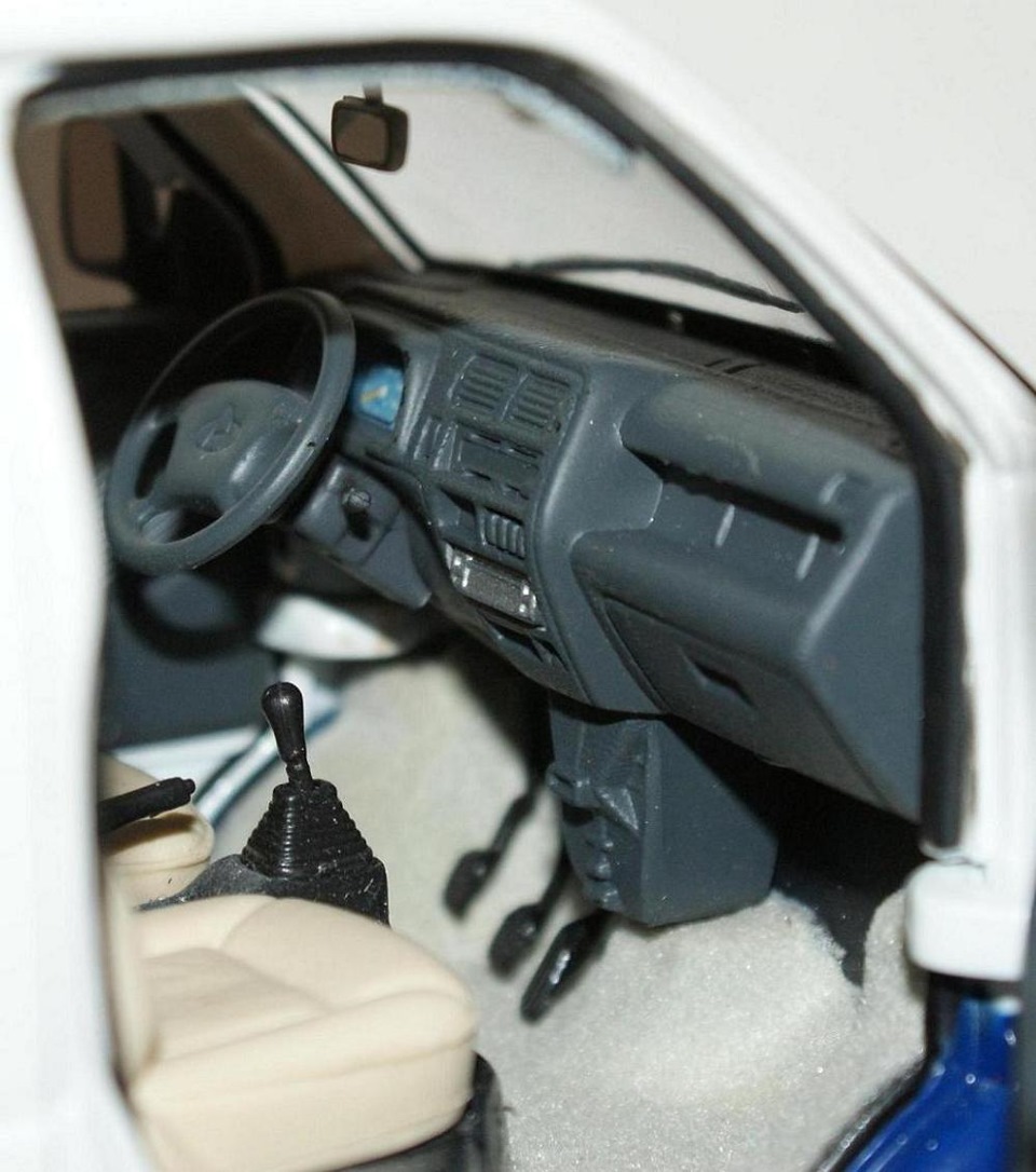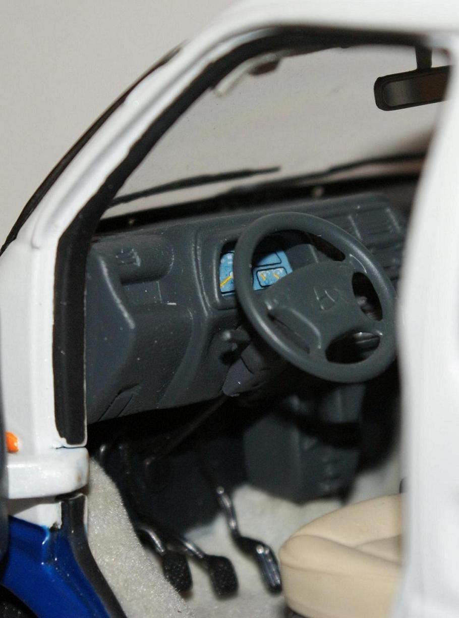 Двери — увы, не все открываются. Так рабочими выполнили передние двери и дверь задка. А вот боковую, увы… сделали глухой, что несомненно обедняет модель и не даёт возможности более внимательно посмотреть внутренности салона. И так — водительская дверь и салон на водительском месте.