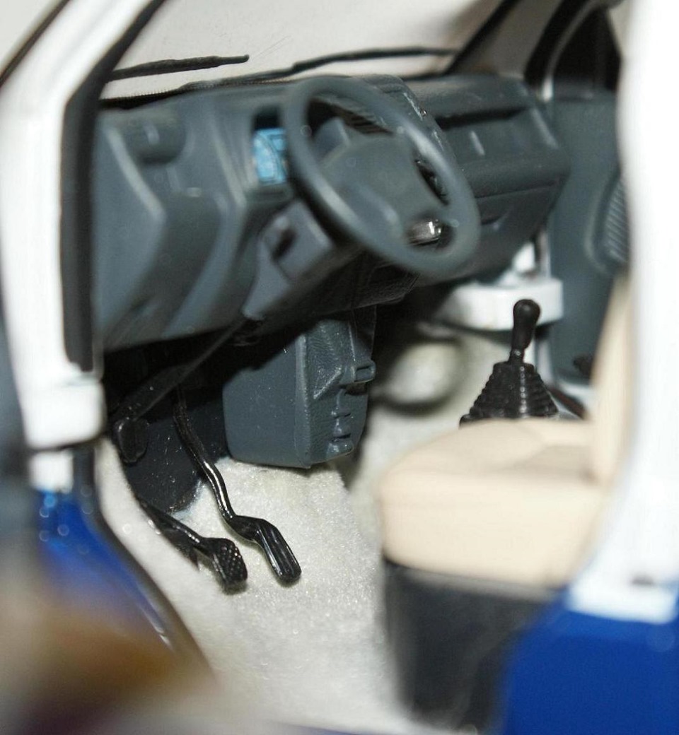 Внутри — всё вроде-бы на месте. Педальный узел присутствует. Рулевая колонка с подрулевыми рычажками — всё есть. Выполнено просто, но довольно таки подробно. Даже рычажок открытия капота не забыли проработать, впрочем как и воздуховод на передней панели и на нижней косоли.