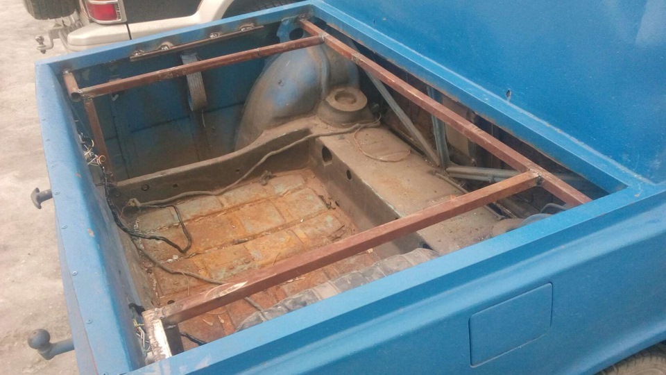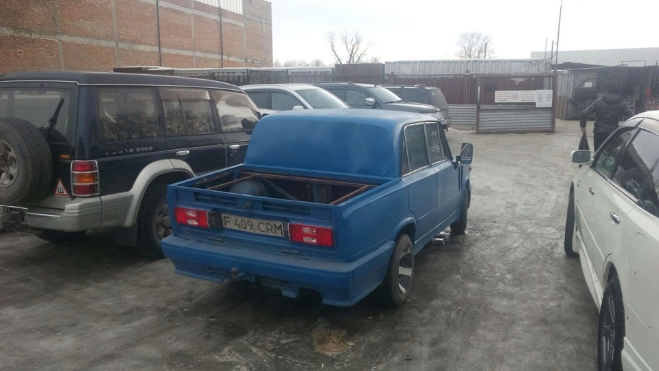 Ехал сегодня по городу, и на светофоре увидел данное чудо))). На багажнике крышка что бы кузов снегом не засыпало или дождём не залило, и задняя часть с фонарями на шарнирах откидывается назад как у джипов! Заднее стекло заварено на глухо))). Покрашена типо под Раптор, или тупо залита гравитексом!
