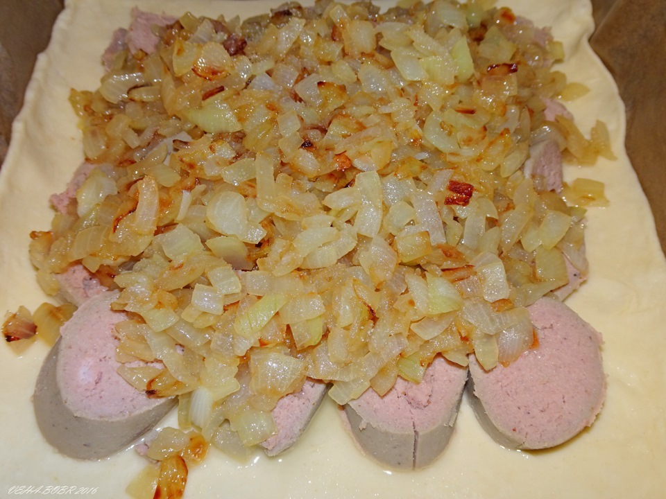 далее раскатали с доченькой одну пластину теста и уложили в противень на бумагу для выпекания, сверху на тесто выкладываю колбаску порезанную пятаками и сверху лук репчатый обжаренный…