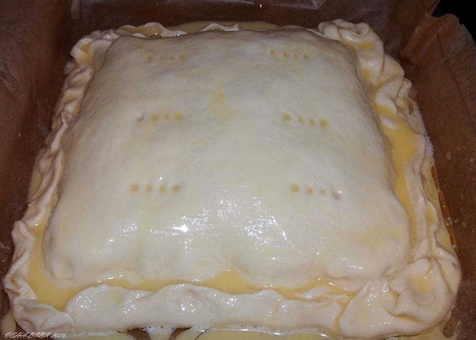 далее закрываю пластиной теста и защипываю края \особо не старался\. затем помазал пирог взбитым яйцом куриным и сделал проколы вилкой… ставлю в духовку на 20 минут при температуре 200 гр. + конвекция…