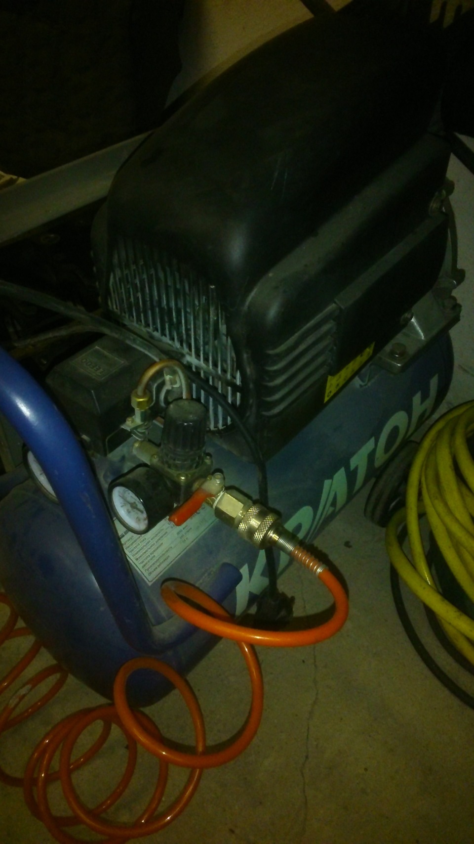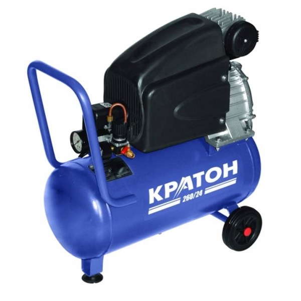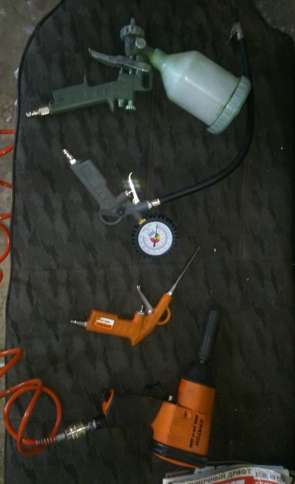 Под бытовые нужды был приобретён компрессор Кратон Hobby 260/40 вместе с нужными комплектующими, а именно пульверизатор для краски, пневматический гайковёрт, пистолет для подкачки колёс, пистолет для обдувки и два воздушных шланга — 5 и 10 метров соответственно.