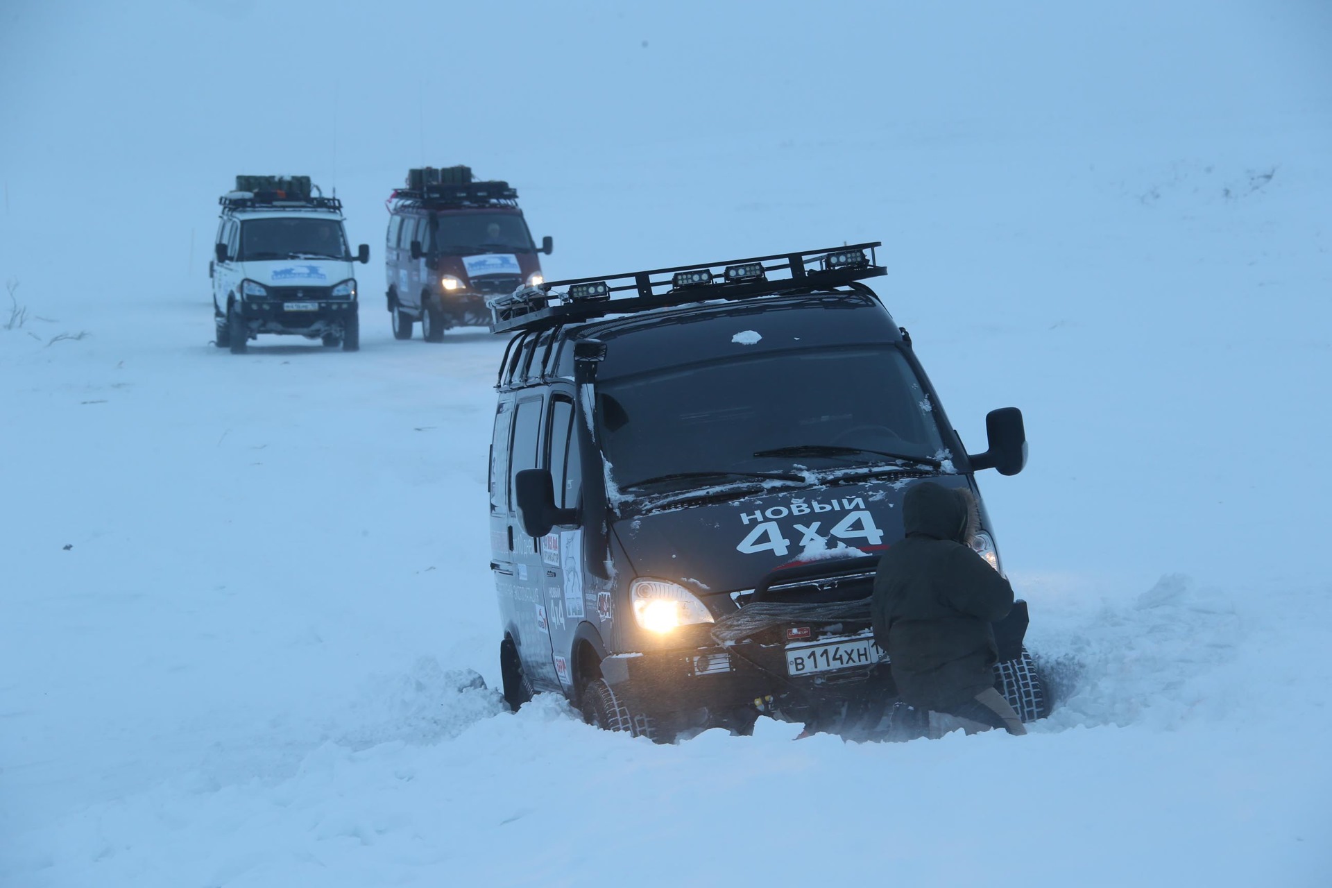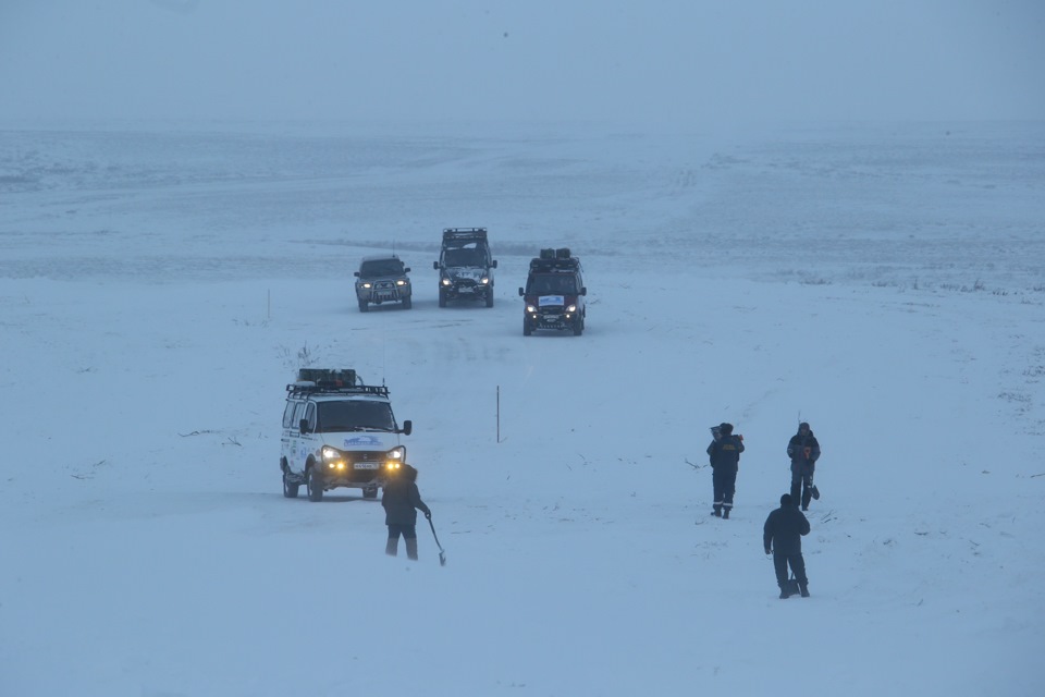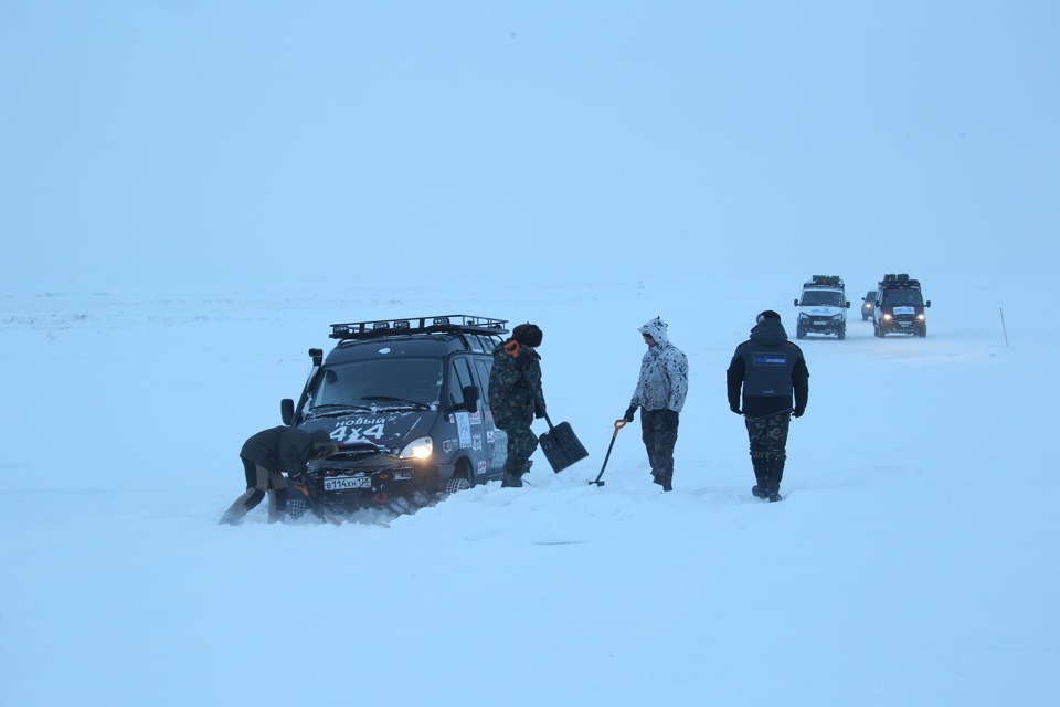 Правила прохождения устанавливает Соболь, который едет первым. Большой ход подвески позволяет методично ехать за Петром прямо по остаткам заметенной грузовой колеи.