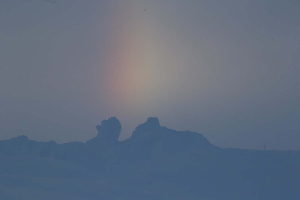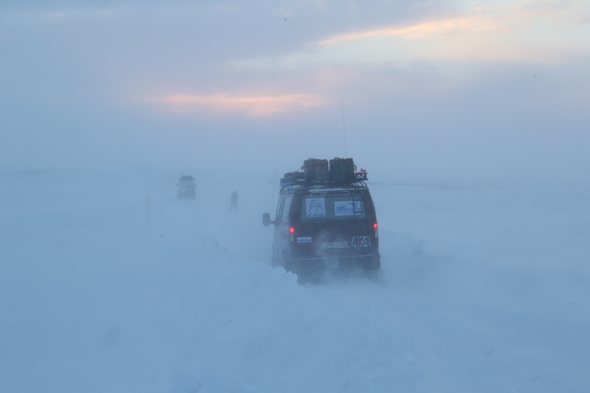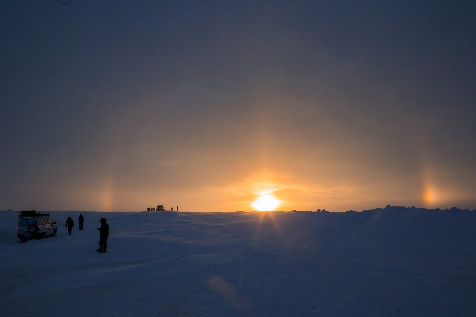 Днем ехать очень сложно. Солнца нет, и ни следов, ни их теней не видно. Мир становится серо-белым, а когда выглядывает солнце, все меняется, как будто кто-то фломастерами раскрасил небо и тундру.