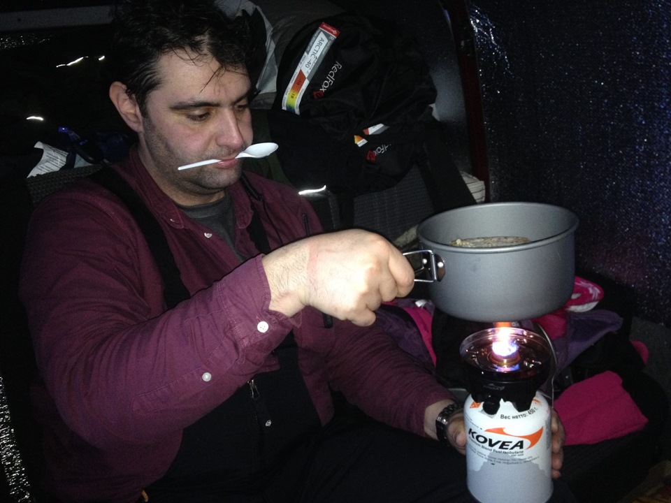 Мы жили вчетвером в нашем внедорожнике, разбив его на зоны по гендерному признаку: Макс жил в передней части, Костя – во втором ряду, мы с Леной – в специально построенной спальной зоне. Сразу, после того, как мы останавливались на ночевку, мы закрывали окна утеплителями, я перебиралась в спальное отделение, переодевалась в «домашнее», и что-нибудь читала, пока Лена с Костей колдовали с едой. Инженером и оператором газового примуса был назначен Костя. Лена подавала «снаряды» — баночки из армейского суточного пайка. Как же это божественно вкусно и даже казалось, что много!
