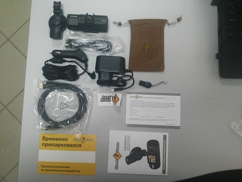 В комплекте мы имеем видеорегистратор, кронштейн со сквозным питанием, зарядное устройство от прикуривателя, так же от сети, кабель USB, HDMI кабель, картридер для просмотра через комп, гарантийный талон и инструкцию