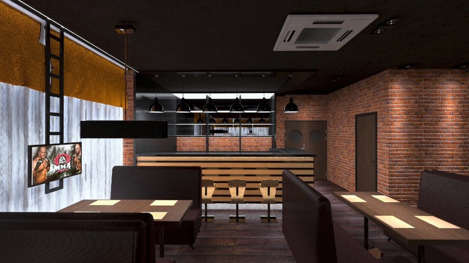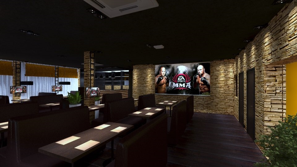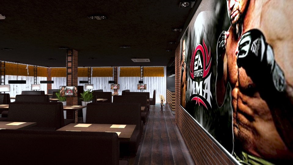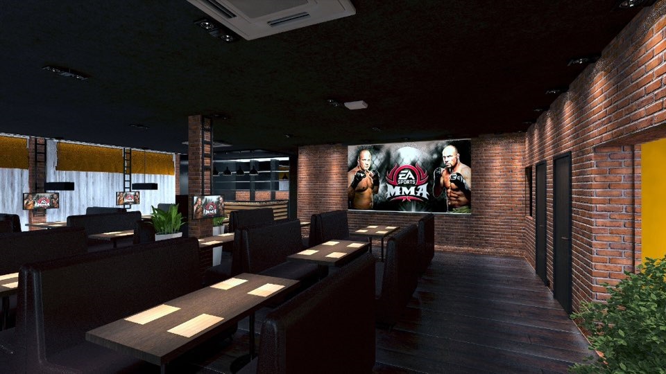 Ну само кафе может быть любым, но если с него есть вид на бокс, то освещение менее яркое, чтобы более комфортно можно было наблюдать за процессом)