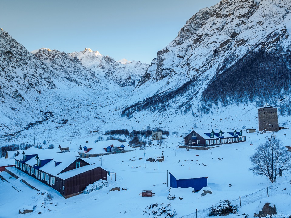 На отметку 4200 метров нас должны были завезти на ратраке, но завести его не смогли — ночью температура была ниже -40. В итоге от станции Мир с высоты 3500 метров мы должны были ехать на снегоходах. По два пассажира на одного угрюмого горца. Но перед этим — в кафе! За занавеской кухни полные улыбчивые женщины в платках огромными половниками наливают из алюминиевой кастрюли наш похожий на глинтвейн welcome drink, к которому в районе барной стойке улыбчивый седовласый мужчина добавляет до верха стакана "Лезгинки". Выпив по стаканчику, мы поехали.