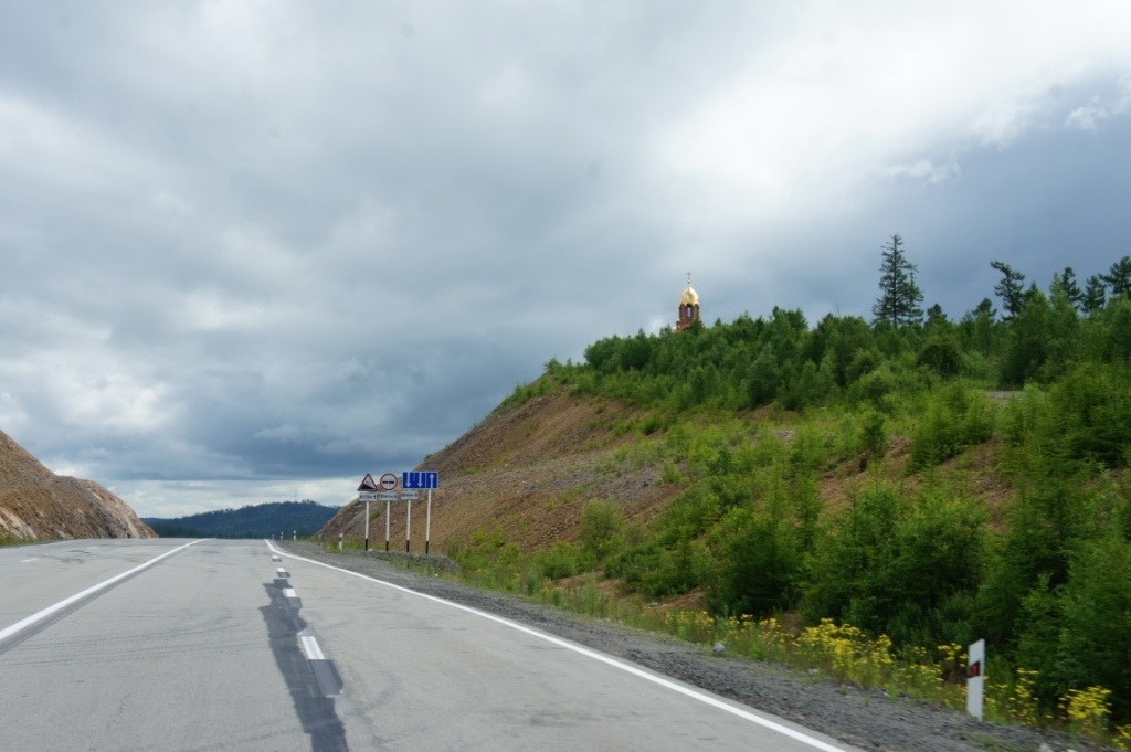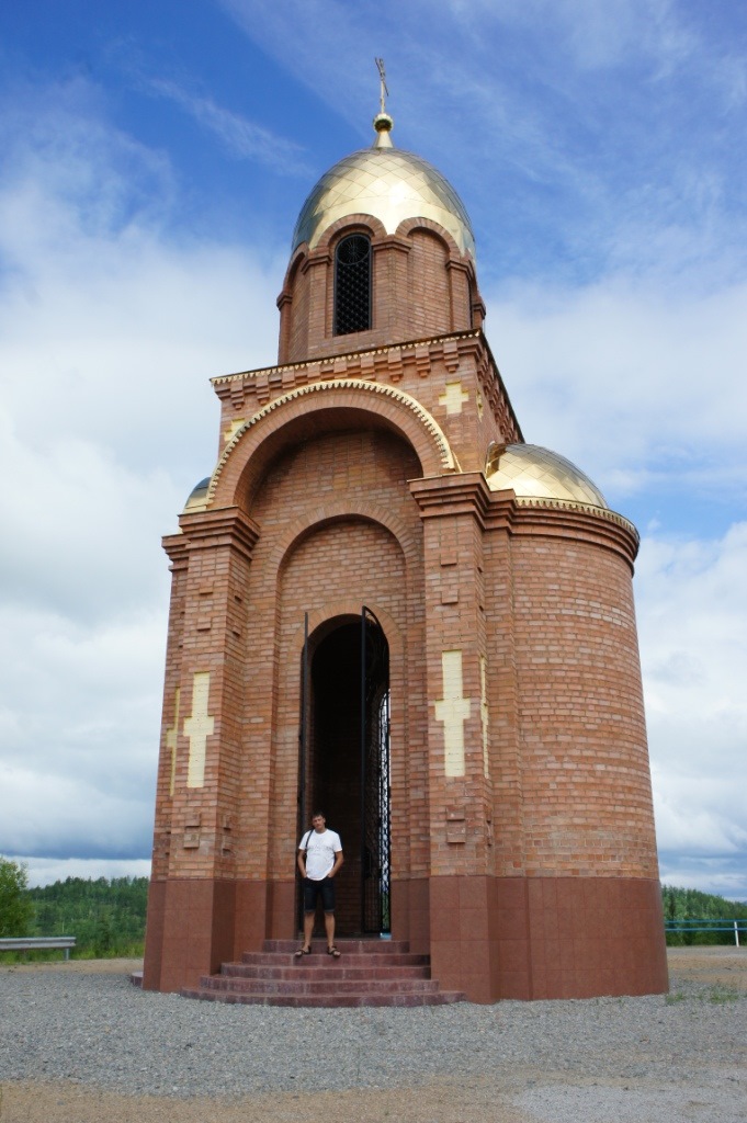 Отъехав от Чернышевска 84 км на перевале Алеутского хребта, названного именем Юрия Тена, замечаем золотой купол часовни в честь Николая Чудотворца, покровителя всех путешественников. Подъехали посмотреть.