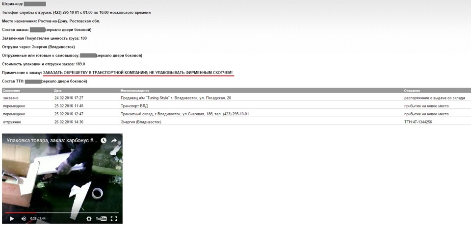 Пример: Покупаю зеркало боковое (донор для не рабочего), нашел, цена устроила, связался с продавцом уточнив необходимое — заказал, оплатил и вот спустя пару суток, приходит оповещение с ссылкой на отгрузку моего товара. Перейдя по ссылке, вижу фото накладной, видео как упаковывали и всю информацию о товаре.