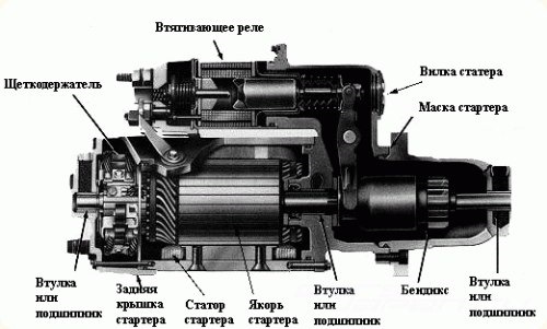 Для начала немного теории. Стартер – это электродвигатель постоянного тока с четырьмя полюсами и четырьмя щетками, привод которого соединен с зубчатым венцом маховика. Включается стартер электромагнитным тяговым реле. Крепится к картеру сцепления и защищен от нагретой трубы выпускной системы специальным щитком.