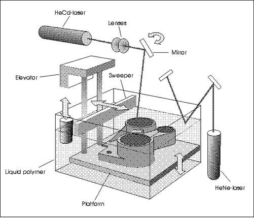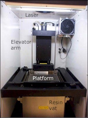 Стереолитография (StereoLithography или SLA) — это исторически первая технология 3D печати. Принцип был изобретен и запатентован Чарльзом Халлом (Charles Hull) еще в 1986 году. Затем Халл основал компанию 3D Systems, которая занималась выпуском соответствующего оборудования. Позже к ней присоединились немецкая EOS GmbH, японские Sony-DMEC и Mitsui Engineering, а также несколько других. Суть стереолитографии в следующем — в рабочей зоне принтера находится жидкий фотополимер. При освещении ультрафиолетовым светом фотополимер затвердевает и превращается в достаточно прочный пластик (фотополимеры активно используются дантистами для пломбирования, так что, думаю, многие из читателей с ними знакомы). Для засветки полимера используется либо ультрафиолетовый лазер, либо обычная ультрафиолетовая лампа (о чем чуть позже). Луч лазера фактически попиксельно сканирует рабочую плоскость и формирует отдельные твердые "пиксели", пока не нарисует на пластике сечение модели. Затем уровень фотополимера повышается (точнее, опускается рабочий стол вместе со сформированной частью модели), и поверх него рисуется следующий слой, пока модель не будет полностью готова. Стереолитография позволяет получить точность "отпечатка" порядка десятых долей миллиметра, хорошо воспроизводит мелкие детали и обеспечивает достаточно ровную поверхность объекта. Эта технология лучше всего обкатана и наиболее широко распространена. Впрочем, не лишена она и недостатков — установки, равно как и расходные материалы, достаточно дороги (цена такого принтера составляет порядка сотен тысяч долларов). К тому же обрабатываемый материал ограничивается только фотополимерами.