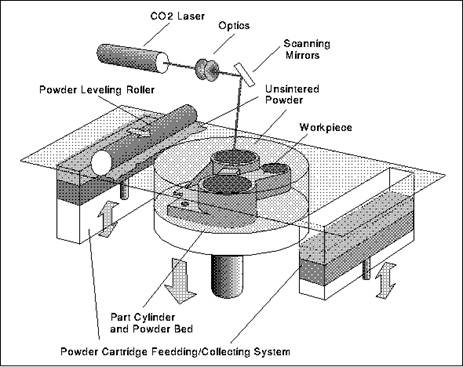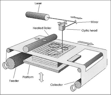 Альтернативный метод трехмерной печати называется лазерным спеканием (Selective Laser Sintering — SLS).Тут, как легко догадаться, тоже используется лазер, но в качестве рабочего материала выступает уже не фотополимер, а порошок какого-нибудь относительно легкоплавкого пластика. Пластик в рабочем объеме SLS-машины нагревается почти до температуры плавления, а чтобы он не загорелся и не стал окисляться, в рабочую зону подается азот. Затем мощный лазер опять же рисует по пластиковому порошку сечение детали, пластик нагревается выше температуры плавления и спекается. Сверху насыпается следующий слой и процедура повторяется. В конце работы лишний порошок просто стряхивается с готовой модели. Этот процесс был разработан в конце 80-х годов в Техасском университете в Остине и запатентован в 1989 году выпускником университета Карлом Декардом (Carl Deckard). Затем процесс был коммерциализирован фирмой DTM Corp. Лазерное спекание тоже обеспечивает достаточно высокое качество деталей, хотя поверхность у них получается пористой. Зато полученные методом SLS модели — самые прочные и эту технологию, в принципе, можно использовать для малосерийного производства. Правда, установка SLS достаточно сложная и дорога, а скорость производства составляет всего несколько сантиметров (высоты) в час (плюс, несколько часов на нагревание и остывание установки).
