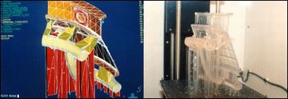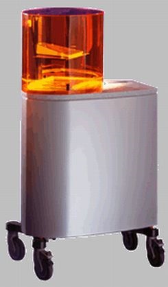 Более скоростной вариант этой технологии первоначально был разработан компанией Cubital Inc. (ныне, судя по всему, покойной). Назывался он Solid Ground Curing или, сокращенно, SGC. В качестве рабочего материала в ней тоже использовался фотополимер, но засветка производилась ультрафиолетовой лампой сразу для всего рабочего слоя. Засветка велась через фотошаблон, который для каждого слоя печатался на стекле по технологии, напоминающей лазерную печать. Обработка всего слоя одновременно вместо попиксельного сканирования лазерным лучом как раз и позволяла достичь достаточно высокой скорости построения объекта. Сейчас систему на похожем принципе предлагает, например, немецкая компания Еnvisiontec. Устройство называется Prefactory (весьма говорящее название) и представляет собой систему быстрого прототипирования для конечного пользователя. Машинка занимает всего 0.3 квадратного метра площади, так что ее можно установить даже в небольшом офисе. Засветка производится при помощи технологии DLP (Digital Light Processing), аналогичной используемым в компьютерных проекционных системах. Разрешение (для одного рабочего слоя) составляет 1280x1024 пикселя при размере пикселя 150 или 90 микрон. Толщина слоев варьируется от 150 до 50 микрон. На Prefactory можно делать прототипы размером около 190x152x230 мм, а скорость печати составляет до 15 мм в час (в высоту). Управляется принтер встроенным компьютером под управлением Linux, а связь с внешним миром идет по Ehternet через локальную сеть. Фактически, посылать задания на Prefactory можно, как на обычный сетевой принтер.