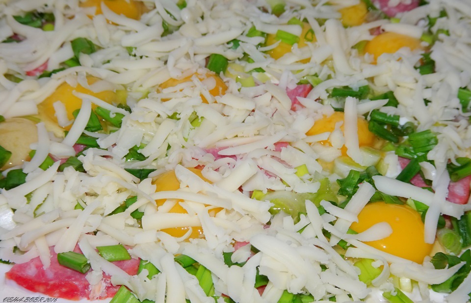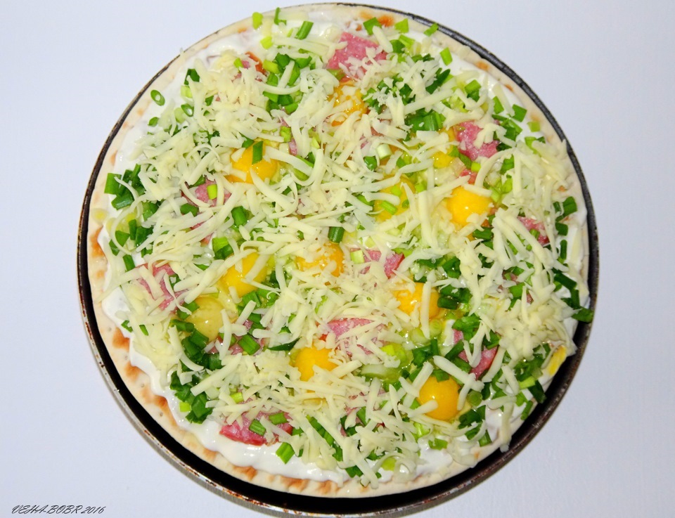 и так основу укладываем на решетку которая установлена в сковороду. основу намазываем домашним майонезом, затем немного колбасы и зеленого лука, затем перепелиные яйца + немного их посолить, далее сыр сулугуни тертый на крупной терке и остатки зеленого лука…