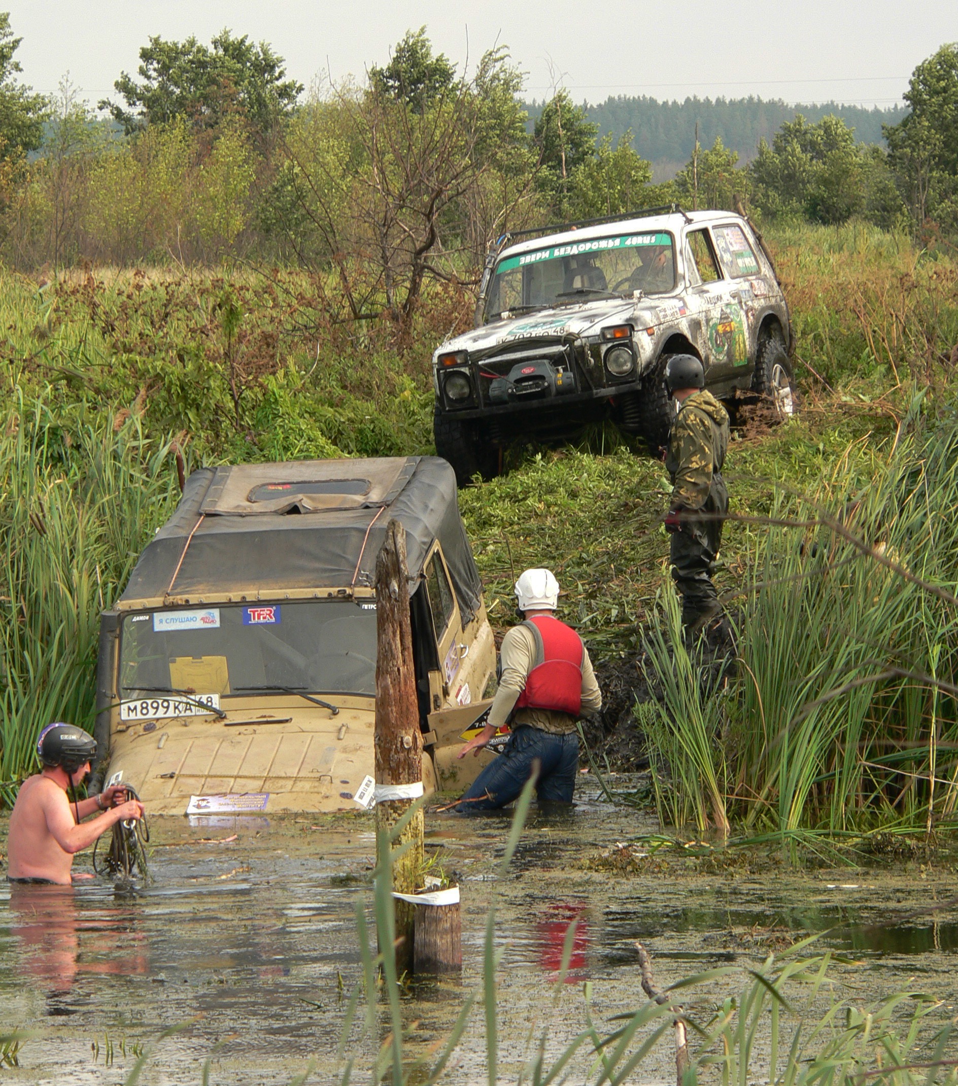 На 6-8 августа на территории Тамбовской губернии, еще в начале года, был запланирован 2 этап серии «золотой треугольник» «Волчья Тропа 2010».Первый этап проходил в Воронеже 23-25 апреля и назывался «шутки в сторону».Третий будет в Липецке «Гондурас Трофи»в октябре. Руководителем гонки является Ваш покорный слуга. Подготовкой трасс занялись мы с Родионовым Романом еще в мае. Было подготовлено 3 СУ по рекам, озерам, заброшенным лесовозным дорогам и по бывшим торфоразработкам. Самое интересное конечно ожидалось на торфянниках. В соревнованиях участвуют категории: стандарт, ТР1, ТР2, ТР3.Удовлетворить потребности всех категорий, как вы понимаете, не просто. За 2 недели до старта приходилось не однократно что-то переделывать, — засуха давала о себе знать. Где проходили только на лебедке –проезжали на заднем приводе. К тому- же сначала нас лесничество оттеснило на луга, а затем администрация области и вовсе рекомендовала, из-за высокой пожароопасности, перенести дату мероприятия на неопределенный срок?Конечно руки опустились. Но ничего не поделаешь, действительно опасно. У меня после брода на глушаке не раз тлела ряска, приходилось вынимать и тушить. И вот определен день мероприятия 27-29 августа! За неделю пришлось подготовить полностью другие маршруты. Вопреки переживаниям спортсменов были и броды, и грязь и болота. Переживаний было не мало, поскольку приходилось все организовывать в последний момент. Огромное спасибо всем участвующим в организации. Спортсмены прибыли из Липецка и Воронежа, ожидалось конечно и из других городов, но из-за переноса как раз на эти даты попадали соревнования в других регионах. В итоге все получилось! Все довольны ! Были обнаженные русалки, до которых надо было с фотиком доплыть, была эротическая мойка машин победителей, в перерыве стриптиз. А так- же утопленные машины, оторванные бампера, разорванные раздатки, куча порванных тросов и движки после гидроудара. Остальное в фотоотчете.