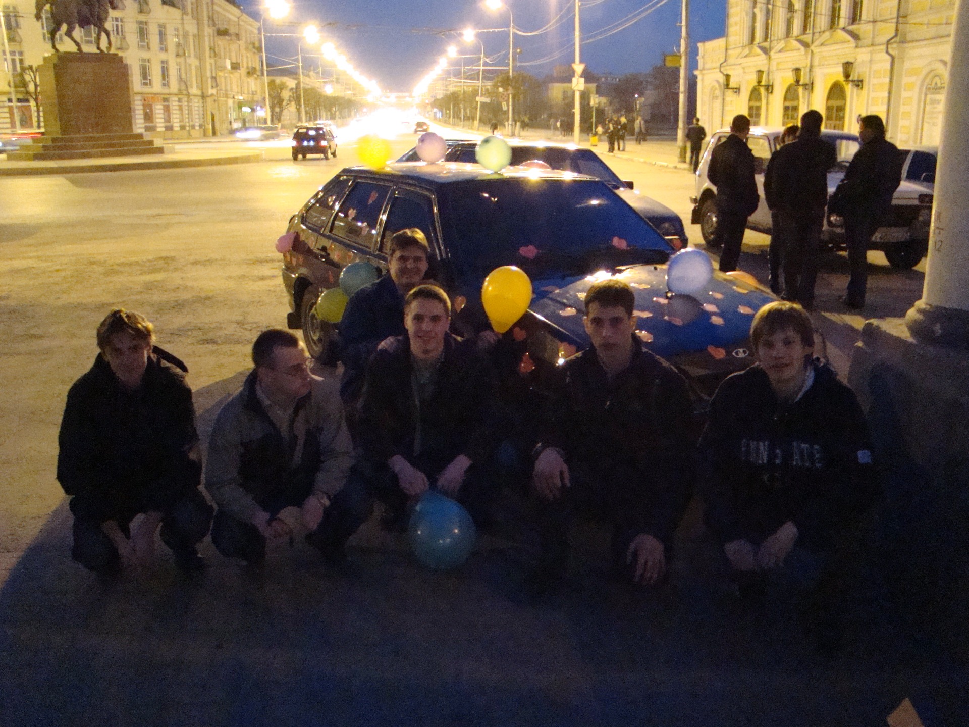 Наконец, приплыли. Замерзшие, как суслики, но довольные :-) А на берегу во всю идет работа. Моя команда импровизирует. Выходим, а по берегу "прогуливаются" знакомые лица :-) Оказывается, в то время, пока мы плавали, ребята решили обновить вид у машины. Пока катались по городу некоторые шарики полопались, и ребята вздумали это исправить :-) Надували по рассказам кто, как мог и как успевал, украшали прямо на площади, а на берег к пристани отправили пару агентов, чтоб просигнализировали при нашем приближении :-) Сработали четко, так, что даже для меня это было удивительно, что машина вновь вся в шариках, да причем даже больше прежнего! Фантастика, просто фантастика :-) Ребята молодцы!