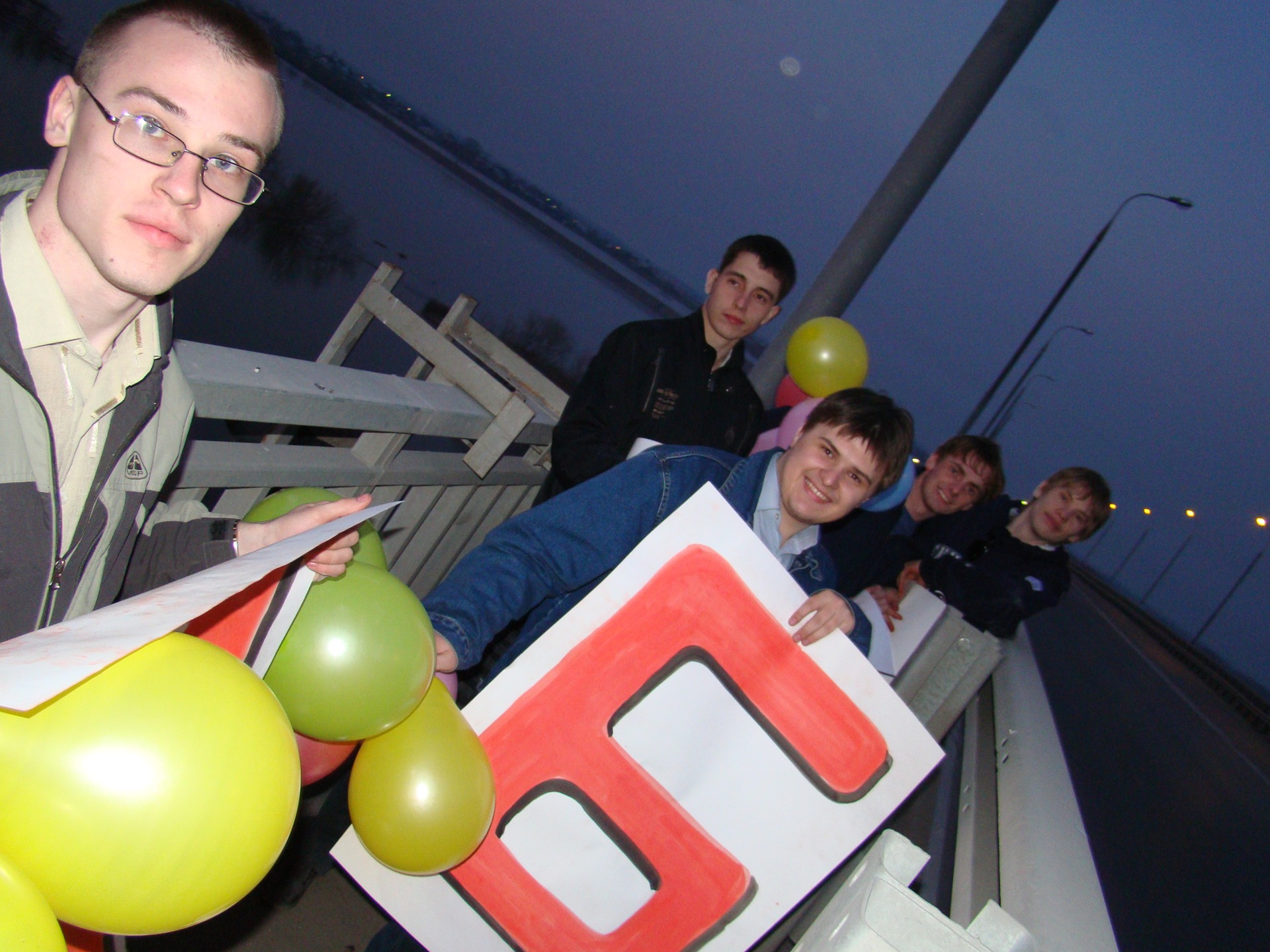 Впечатленная рассказом про неудавшуюся затею, она и не обратила внимания, когда я предложил ей пройти на нос теплохода, в то время, как тот подплывал к мосту через реку. А на мосту я уже заприметил кучку людей — это была моя команда! Они успели! Ура!