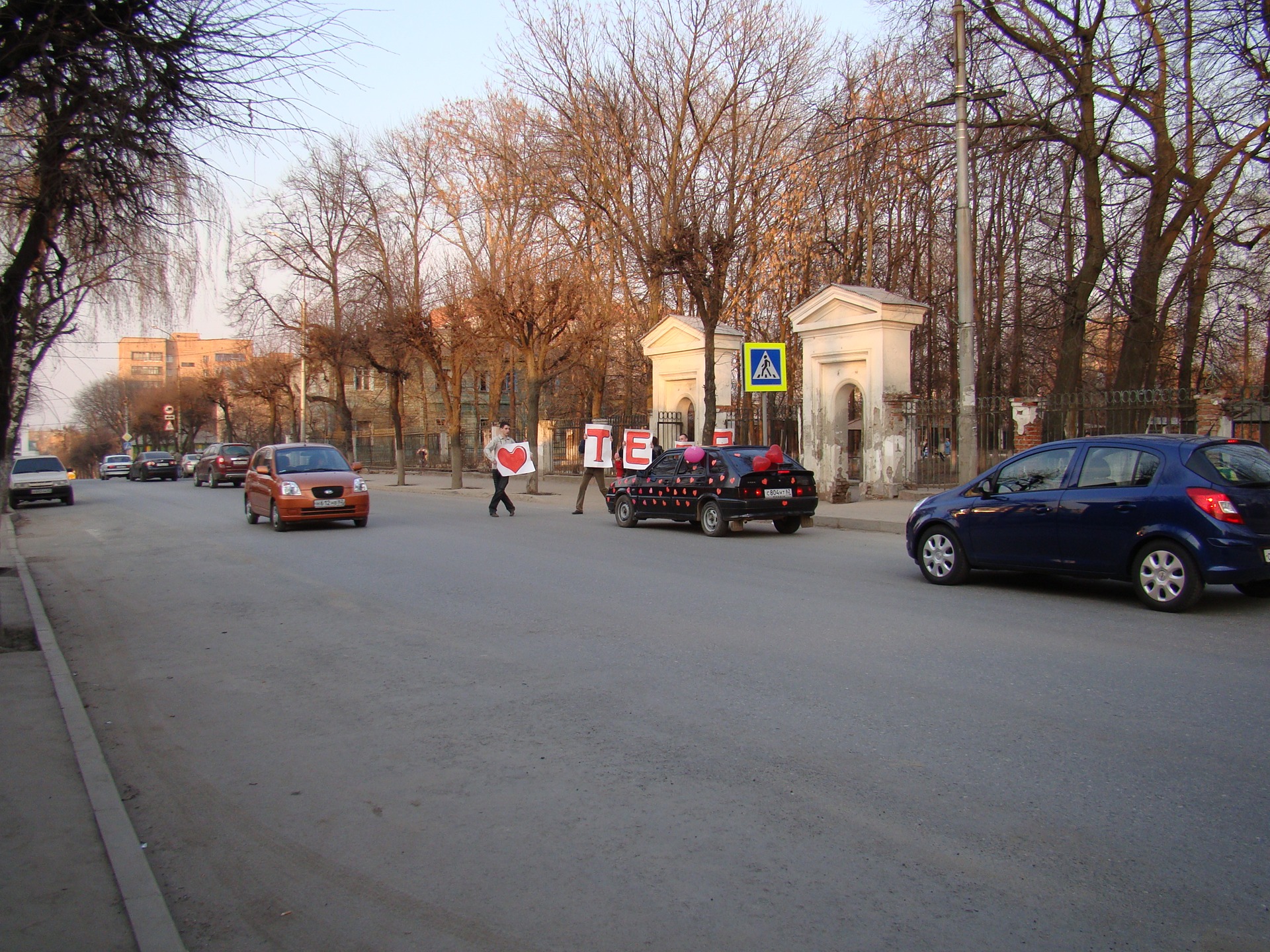 Была мысль подстроить маршрут таким образом, чтобы он проходил мимо поста ГАИ или патруля на машине. Едем мы на раскрашенной машине, а нас останавливает блюститель порядка, спрашивает документы и, быть может, начинает показательно к чему-нибудь придираться (ну например, к специально налепленному сердечку на фару), чем вызывает некоторое волнение у объекта. А в конечном итоге уводит меня к себе в машину для разбирательств, а возвращается один с букетом цветов. Дарит, естественно, говорит, что это шутка, желает всего хорошего и счастливого пути. Идея не удалась, поскольку гайцы узнают свои маршруты только на утреннем разводе, и никто не знает наперед, где окажется на следующий день. А еще хуже то, что их в любой момент могут сорвать с патрулем в другой район города или, скажем, на разбирательство ДТП. Я 15 минут, наверное, общался с остановившим меня гайцем, когда он мне все это объяснял: