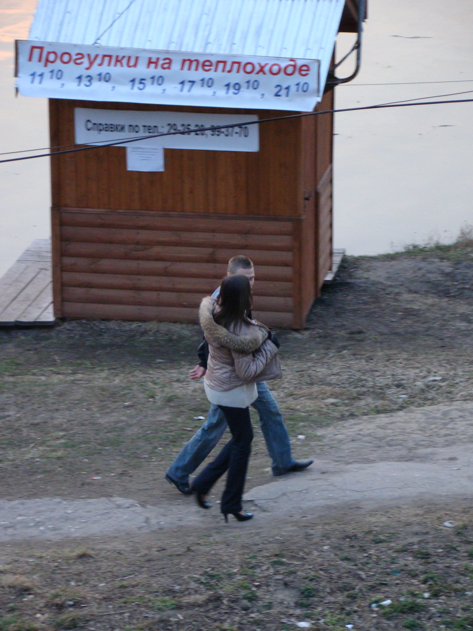 Далее по плану было плавание по Оке на прогулочном теплоходе. Некоторые воспоминания о прогулках на теплоходе у нас уже были — годом ранее имели возможность покататься :-) Вот я и подумал, что повторить было бы неплохо, несмотря на нежаркую погоду (апрель все-таки как-никак, еще разлив во всю идет). Известив ее о моем намерении прокатить ее на теплоходе и получив в ответ опасение, что мы там околеем от холода, я повел ее в машину, где к ее очередному удивлению приготовил специально теплые вещи для нее и для себя.