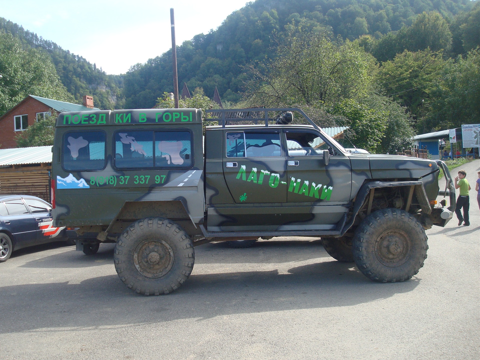 у местных я узнал что водителя зовут Сергей, что он сам её собрал, возит всех желающих, за умеренную плату естественно, в горы, на охоту, рыбалку и просто покатушки. Машина стоит на учёте, но на трассу ей выезжать запрещено… ну собственно вот!