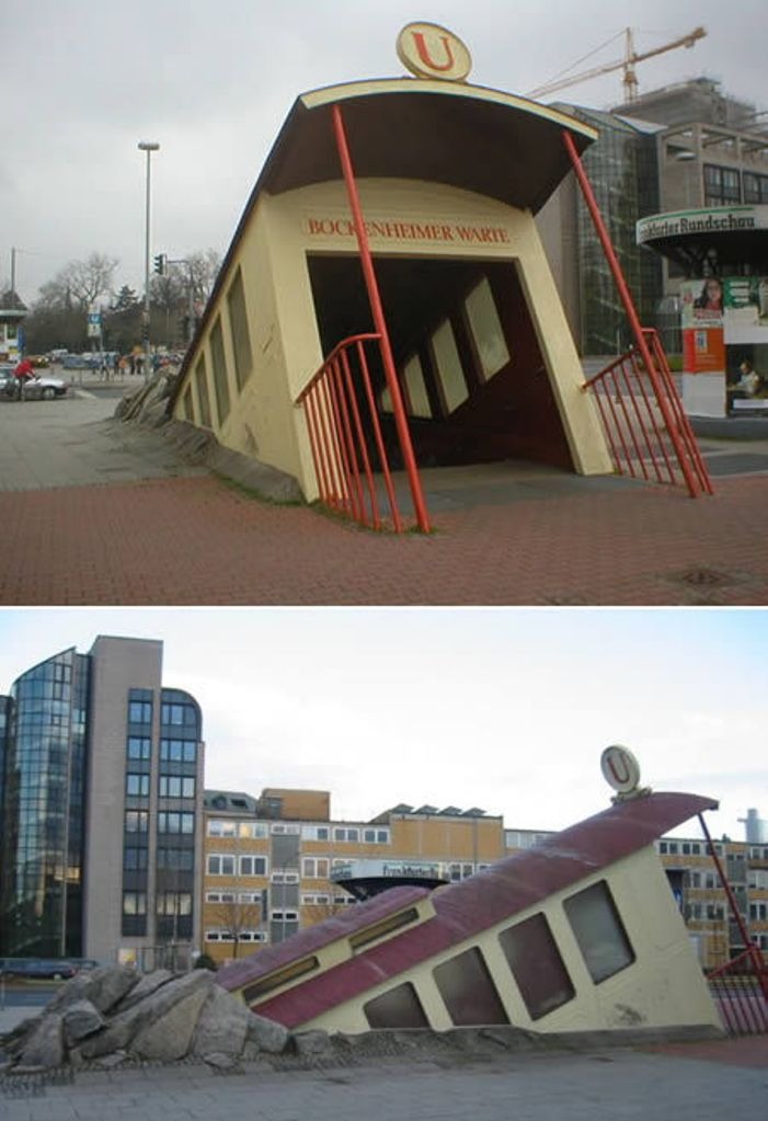 Третье место занимает станция немецкого метро — Bockenheimer Warte во Франкфурте, вход в которую исполнен в виде вагона поезда, проваливающегося под углом под землю.