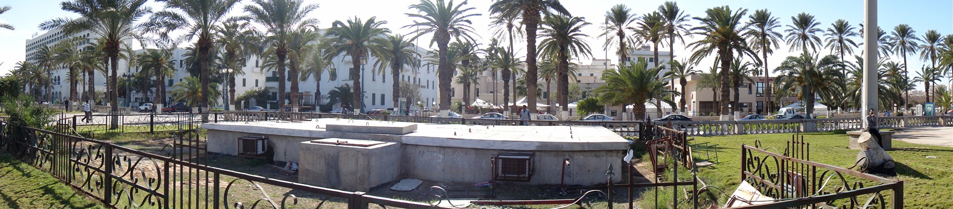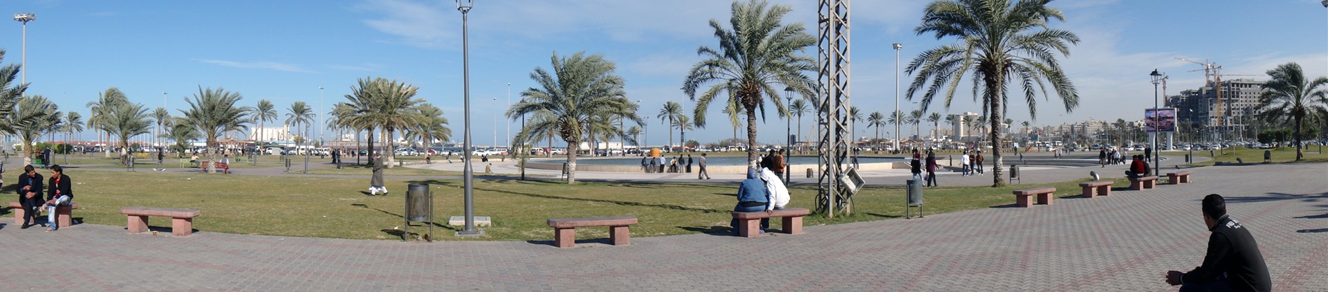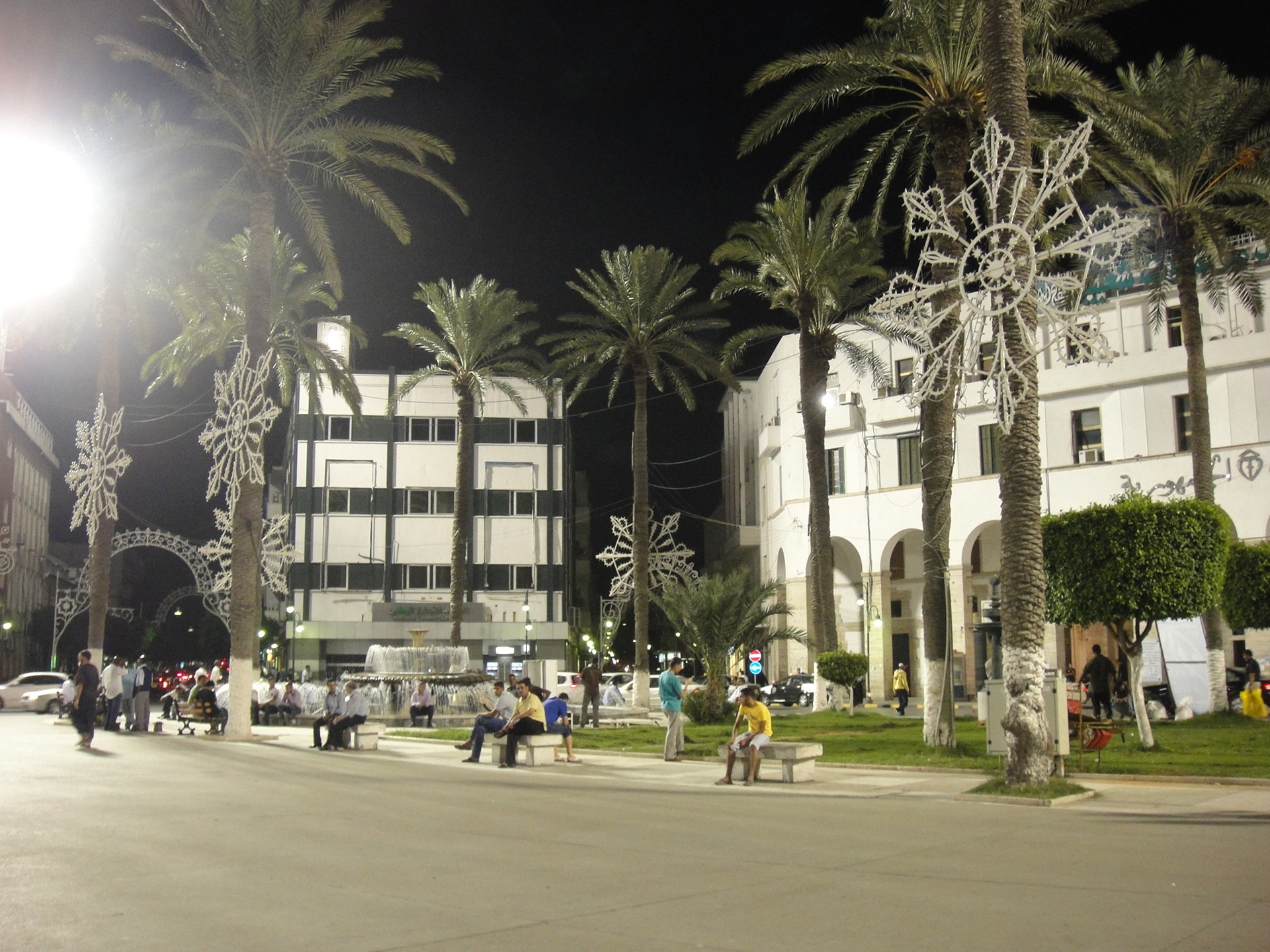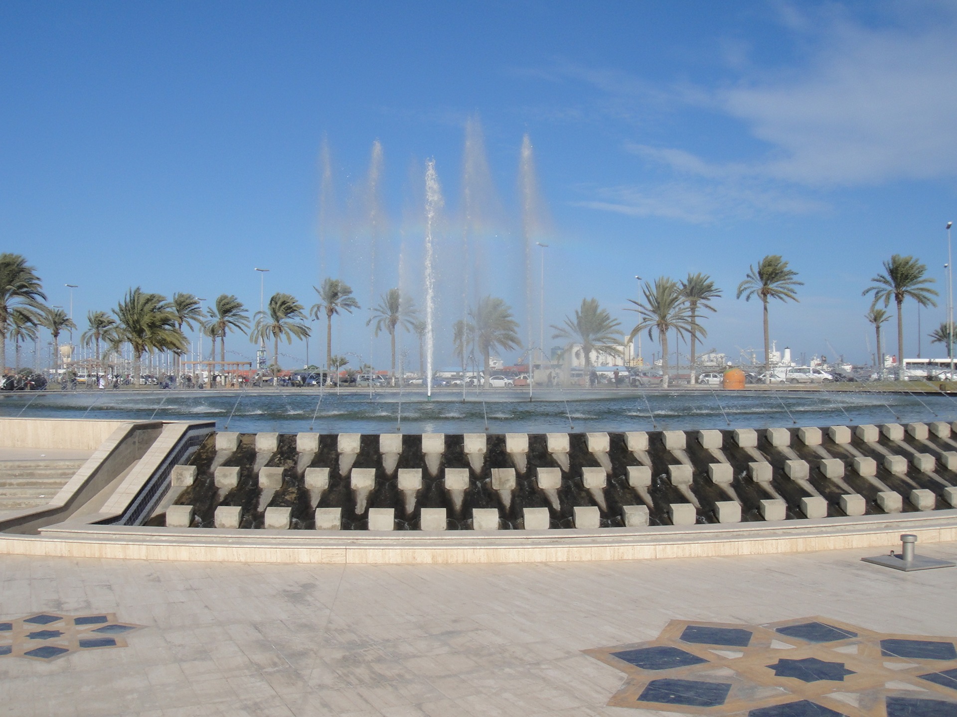 сама площадь заасфальтирована, а рядом есть большая "поляна", на которой размещён огромный фонтан, много лавочек, где Ливийцы отдыхают и расслабляются…