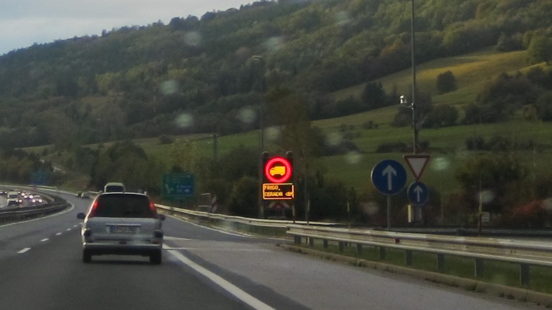 Впрочем, отрезок дороги на Горицию запомнился не этим. Во-первых, там был сильнейший порывистый ветер, порывами которого машину, бывало, переставляло чуть не на половину полосы в сторону – на табло светились временные знаки ограничения скорости (60), но публика ехала около 90 км/ч – а местные так и вовсе валили на все деньги. Движение грузовиков было полностью запрещено теми же временными знаками на табло: