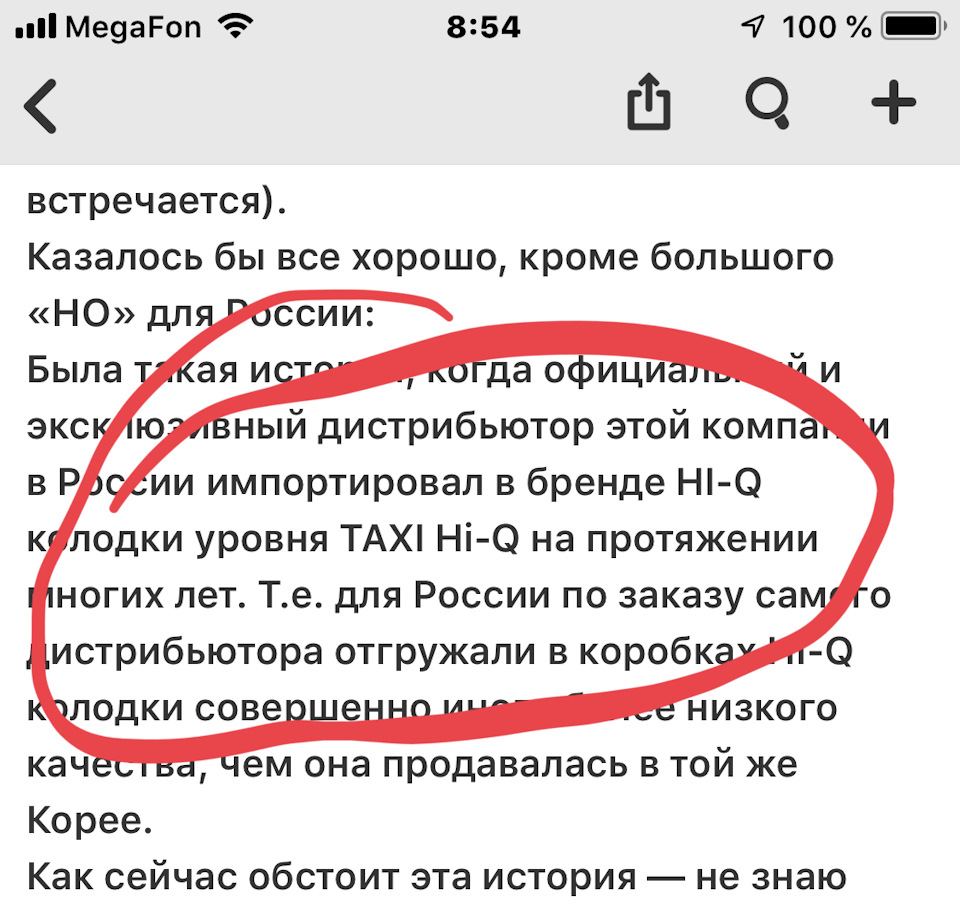 А если по конкретики я около 12 лет занимаюсь автозапчастями в основном клиентура мелкая розница и автопарки. Не могу знать как дела обстоят на крупном контейнерном рынке, но на мелком опте представление имею не по наслышке. Мою бурную реакцию вызвал наверно больше ваш заголовок «вся правда о…» а правда далеко не вся в этой статье да я думаю вы и сами это знаете. И опять же конечного потребителя за частую волнует вопрос качества а не история бренда суббренда и тд. Так вот о качестве очень мало в вашей статье, а сравнительных тестов продукции конкретной осматриваемой марки вообще нет… по поводу такси сделал скрин выделил красным и далее по тексту. И коротко по поводу санг синг возьмём например sp 1363 по каталогу это сангсинг но по факту придут колодки HIQ магия и это будет как раз самый простой вариант мягкие колодки которые пылят мало ходят и не убивают диск а есть вариант нр 1363 тоже сангсинг но стоит в среднем в 2,5 раза дороже и уже совершенно с другими качествами и тд. Вот больше на что я хотел обратить внимание что у каждого из указанных брендов есть как простые варианты так и дорогие и качество совершенно разное как и цена а если поизучать бортжурналы то многие кто используют колодки hi-q как раз покупают “sp” да и у меня на точках таза самая история «мне сангсинг за тысячу возьмите trv за три нет дорого возьмите сангсинг за две нет давайте за тысячу дорого… я думаю вы поняли мою мысль, я сам ставил корейские колодки на свои машины и да есть разница но между сегментами а не производителями как таковая.