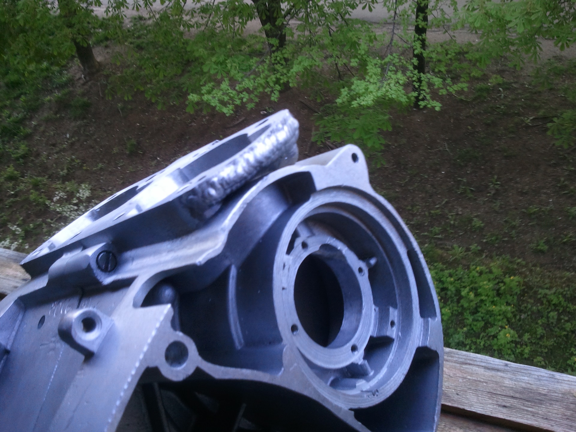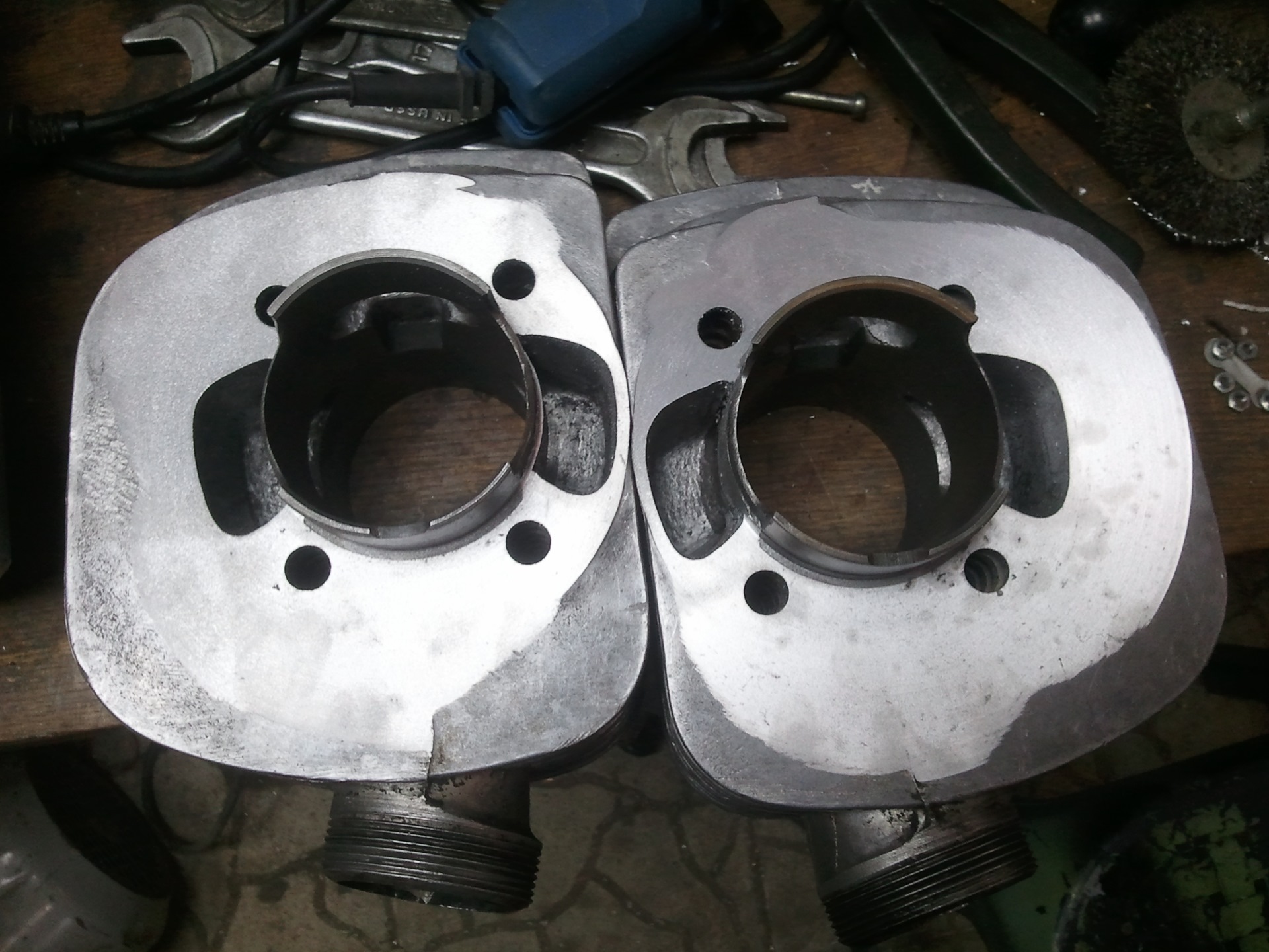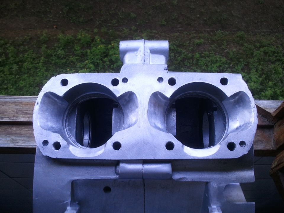 Продувка была расточена по максимуму на картере, так и на цилиндрах, на картере пришлось доваривать стенки из-за их тонкости, цилиндры пришлось стачивать на 5мм снизу, на 1мм сверху и на 5мм с картера, потому что японопоршни были на 11мм короче родных…