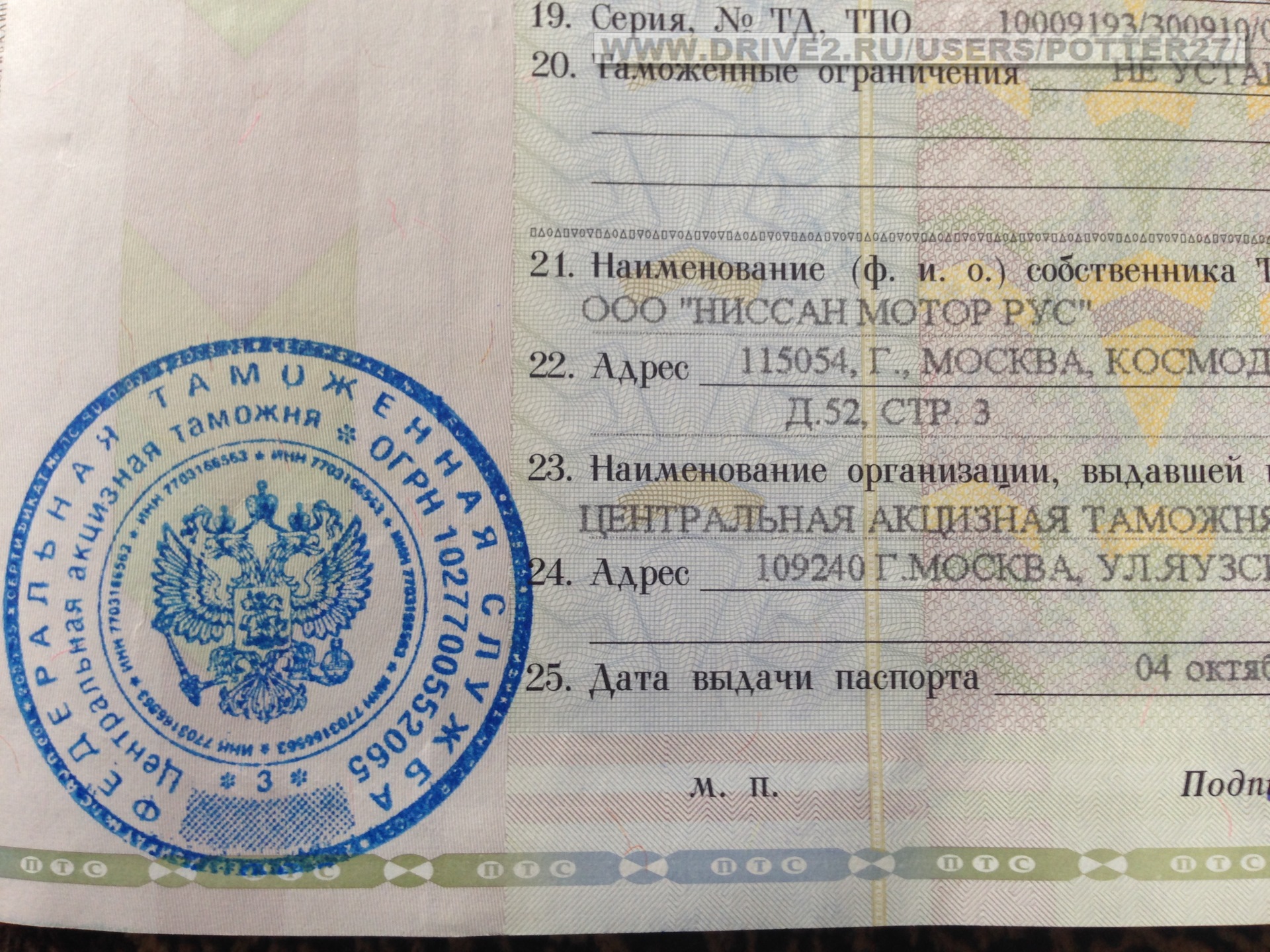 1. Центральная акцизная таможня — это если авто таможили в Москве. В моем нынешнем ПТС стоит "Первомайский таможенный пост", т.к. авто ввозили из Кореи через Владивосток и там же таможили.