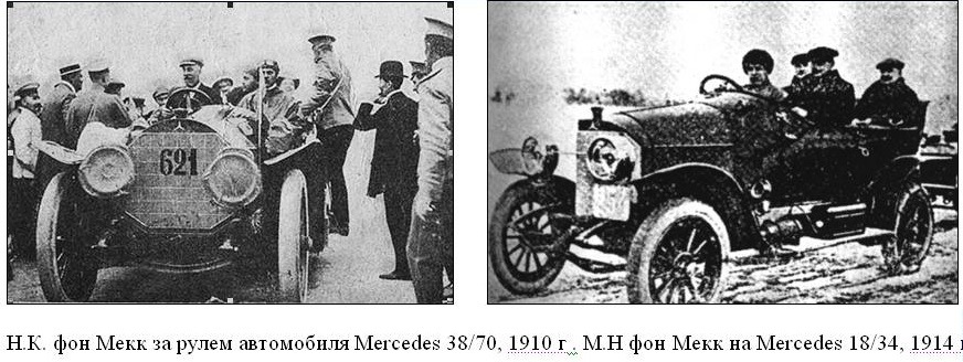 Барон Н.К. фон Мекк pано увлекся автомобилизмом и стал одним из учредителей 20.03.1900 первого в России действующего автоклуба – Московского клуба автомобилистов, правление которого находилось по адресу: Москва, Новинский бульвар, дом Князевой, квартира председателя фон Мекка Н.К. Член Российского автомобильного общества (РАО), которое с 1909 года было взято под покровительство Его Императорского Величества Николая II и стало Императорским (ИРАО), он входил в состав комитетов и технических комиссий Общества. Входил также в группу старшин и в состав гоночной комиссии Первого русского автомобильного клуба в Москве. Свой первый автомобиль барон фон Мекк приобрёл в марте 1899 года, это был немецкий «Даймлер». В период 1906–1913 годов Н.К. фон Мекк владел десятью автомобилями и двумя автобусами, все они были марки «Мерседес» производства фирмы «Даймлер». Последние два «Мерседеса» барон фон Мекк приобрел 5 декабря 1913 года. По данным архива фирмы «Даймлер» обе машины с двигателями мощностью 25 л.с. и кузовами типа «отель-омнибус» (комиссионные листы №№ 15308 и 15309) были отправлены по его заказу через Московское отделение фирмы «Общества Моторов Даймлер».