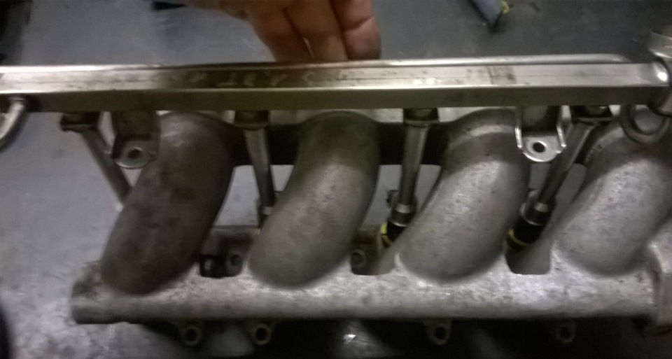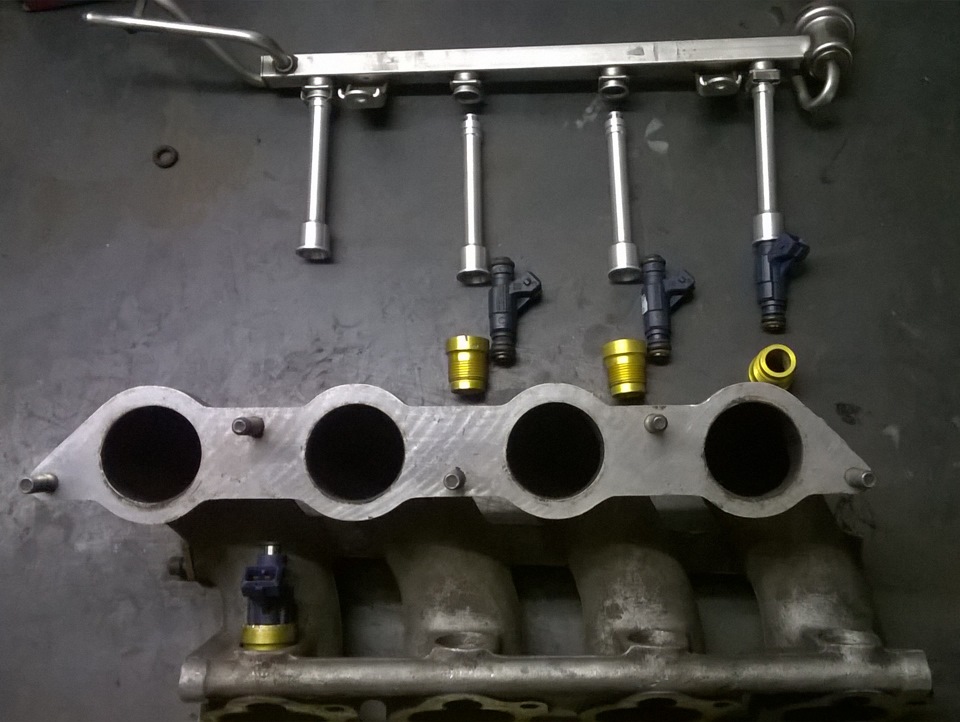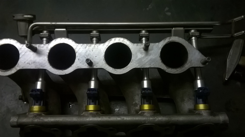 11. Система подачи топлива: Для установки электромагнитных форсунок во впускной ресивер изготовлены посадочный гнезда для форсунок, на внешнюю сторону рогов приварены крепления и установлена рампа с мотора VW 1.8т c регулятором 3.0 бар. Форсунки с рампой соединены удлинителем. Удлинители и посадочные гнезда изготовлены из Д16Т. Топливный насос с мотра VW VR6 полностью взаимозаменяем в посадочное место родной колбы.