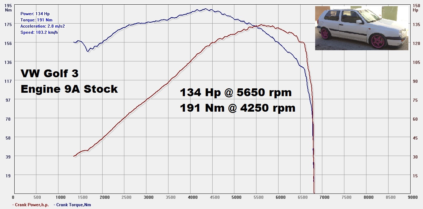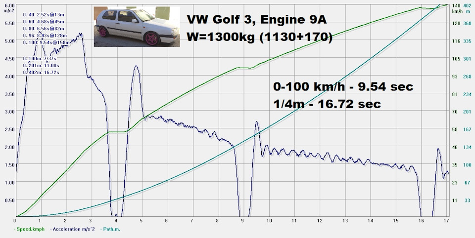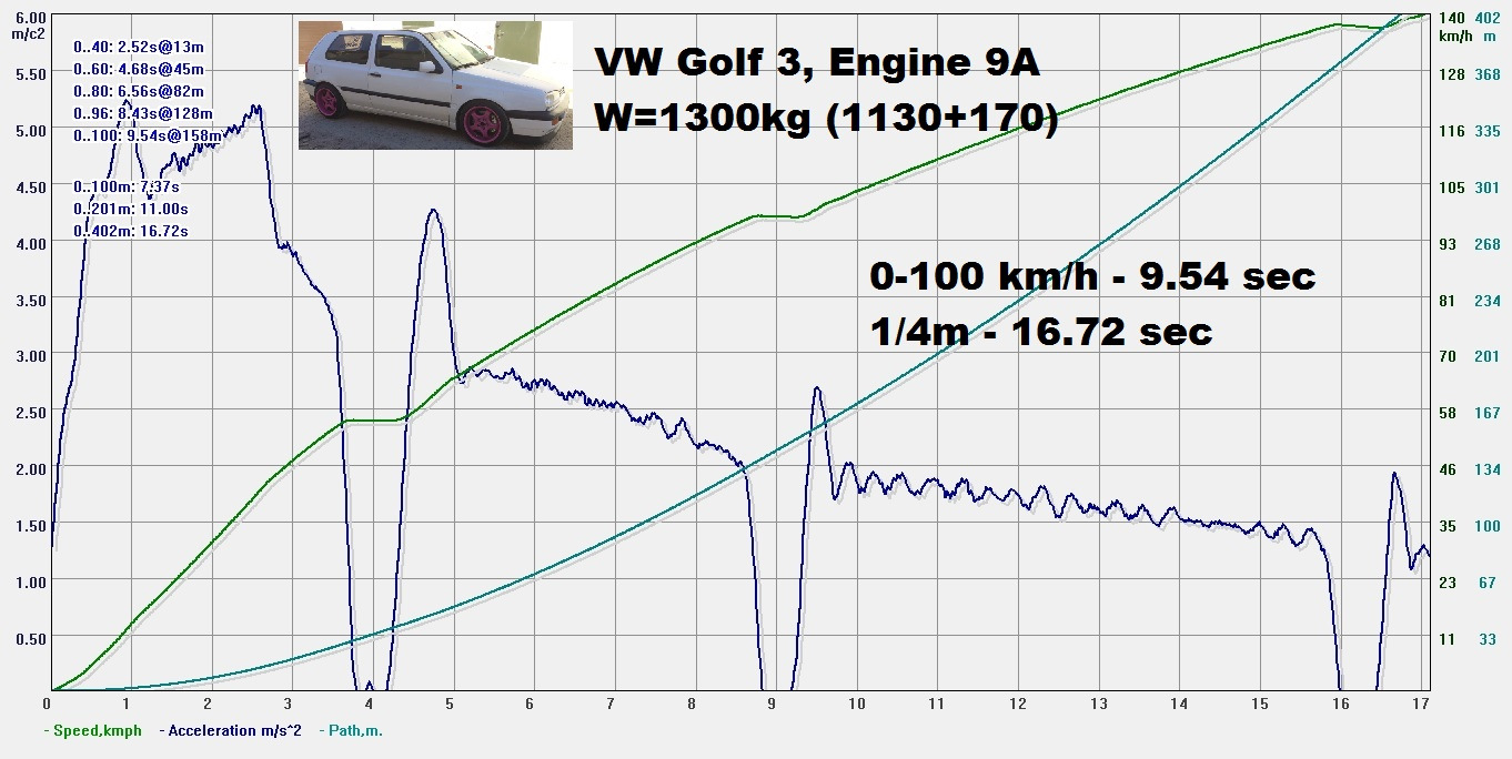 Я там бросил ссылку, красный гольф с мотором 9а и двумя выпускными валами в ГБЦ, с доработанной головой — стабильно выезжал из 16 сек на драг-стрипе. На обычной дороге буксуют долго на первой передаче. и когда я меряю, я сижу в машине, а это свыше 100 кг — тоже учитывай.